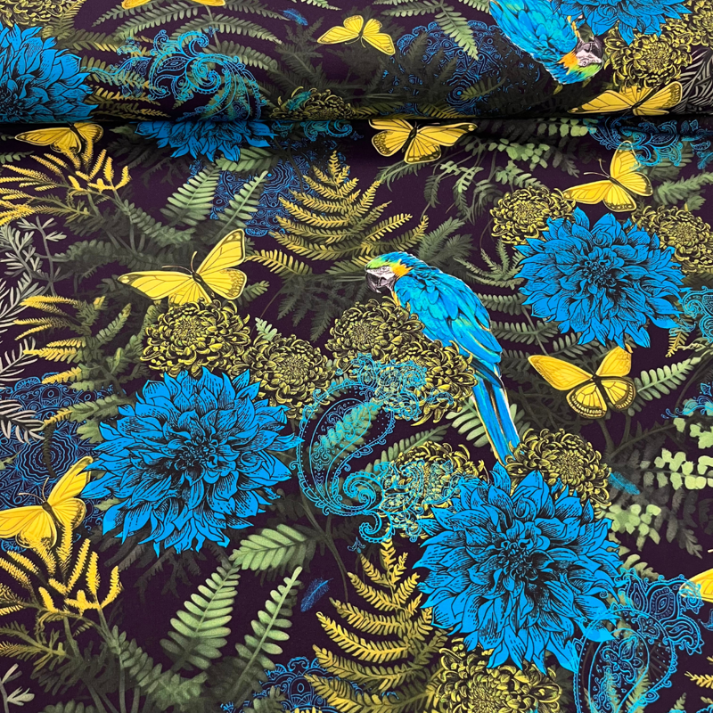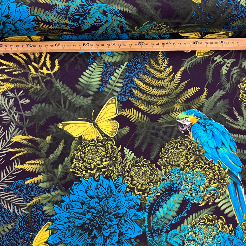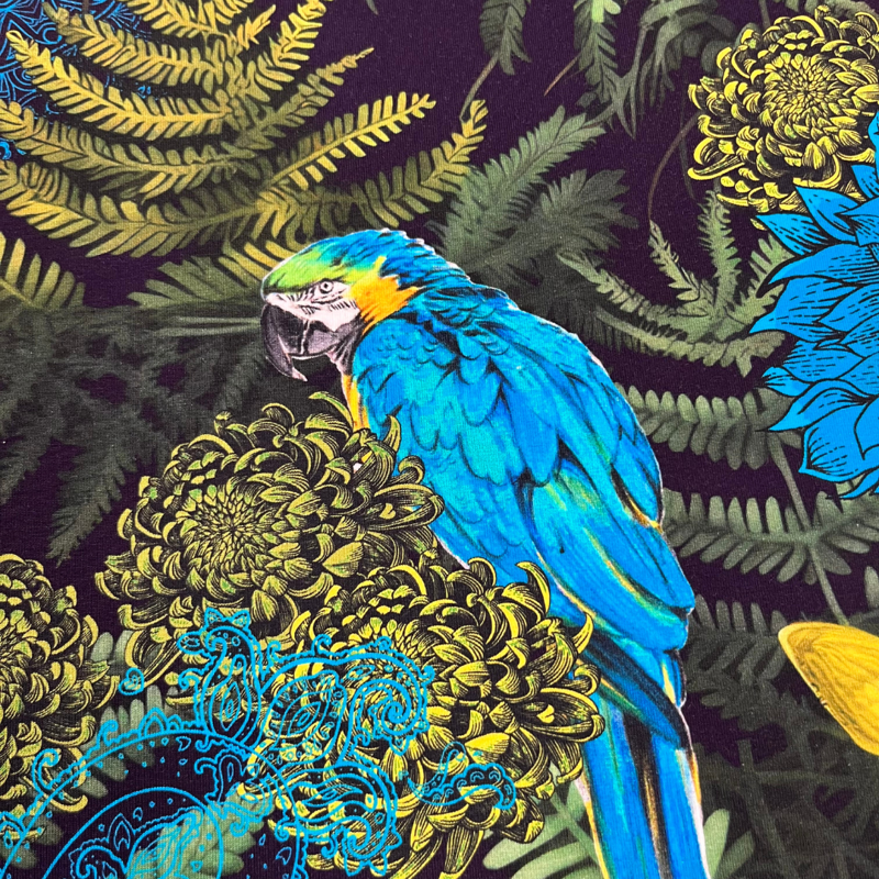 Wat een tropische blikvanger! Deze katoentricot barst van kleur en leven. Op een donkere ondergrond zie je felblauwe papegaaien tussen tropische bladeren, gele vlinders en grote bloemen in blauw- en groentinten. Een unieke print die direct vrolijk maakt.