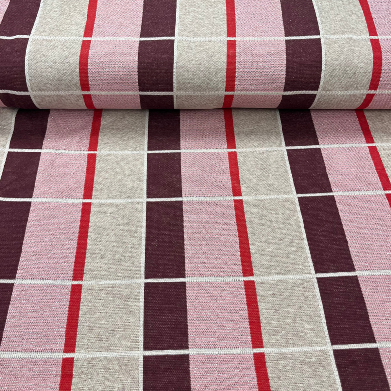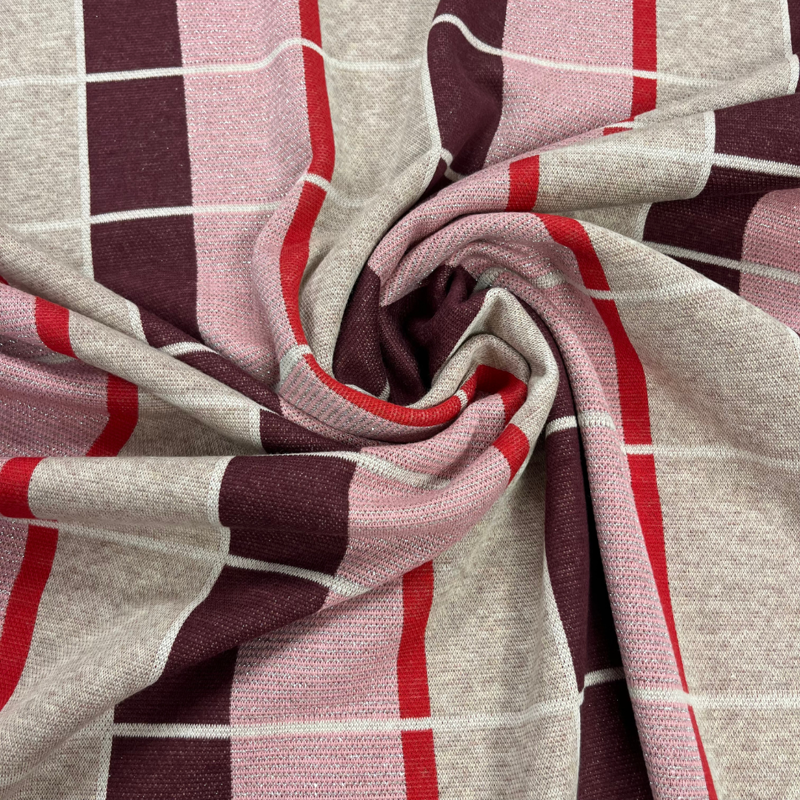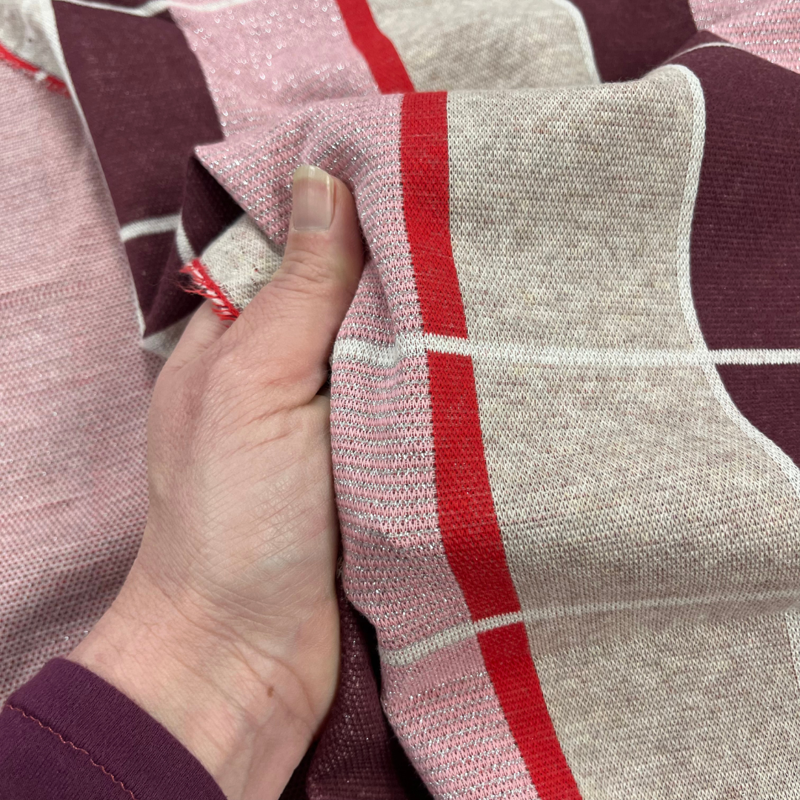 Deze Alb Stoffe Gleam Suncheck jacquard jersey is onderdeel van de Gleam collectie en valt op door het grafische ruitdessin met een subtiele glans. De stof is geweven als jacquard jersey van biologisch katoen, verrijkt met een zachte soft-touch lurex draad voor een verfijnd effect.