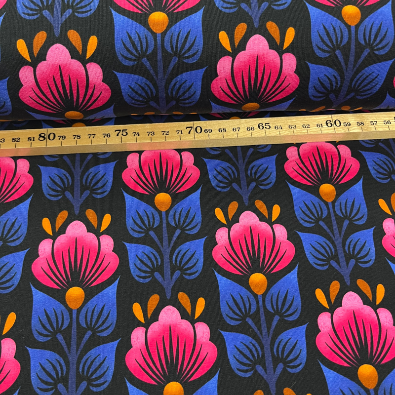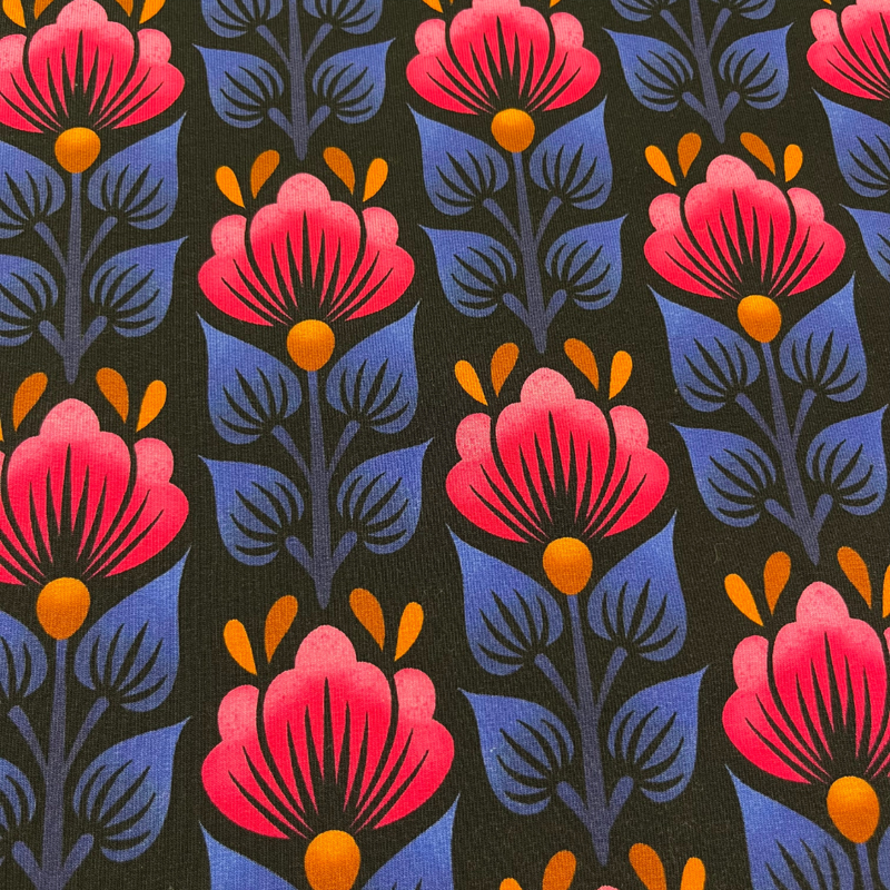 Het dessin bestaat uit krachtige, grafische bloemen in een speels en modern patroon, perfect om jouw zelfmaakprojecten net dat beetje extra uitstraling te geven. De intensieve kleuren en het stijlvolle ontwerp maken deze stof ideaal voor zowel dames- als kinderkleding.