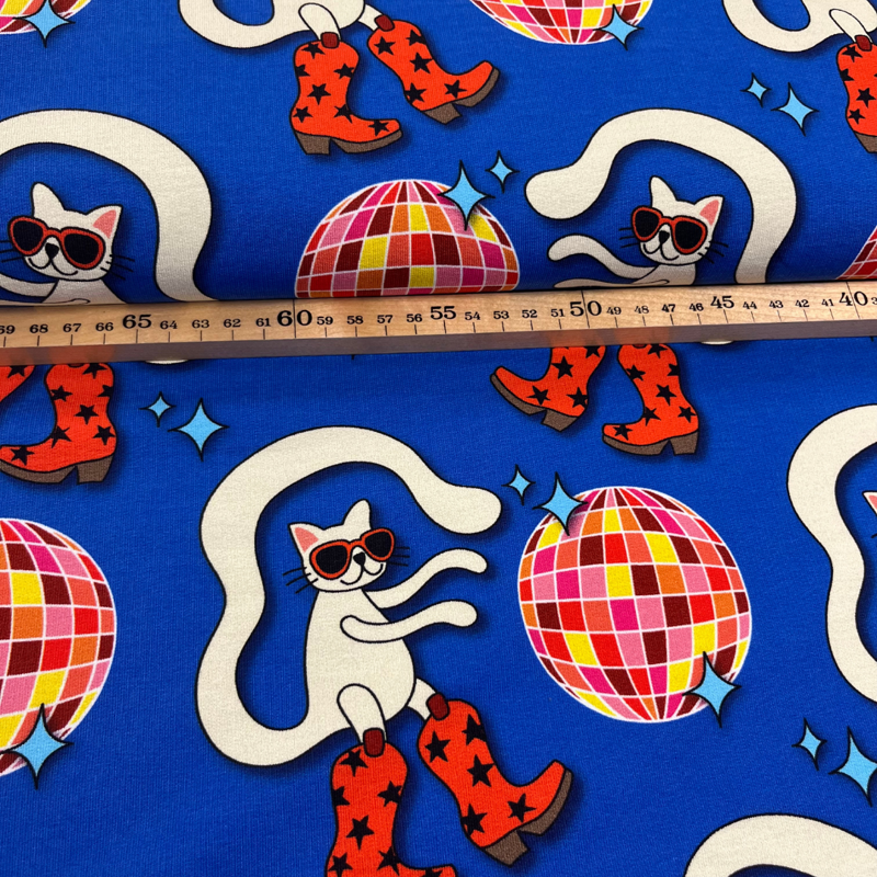 Ga helemaal los met deze vrolijke sweatstof uit de Choose your Vibe collectie van Hamburger Liebe. Het speelse design met katten, discoballen en funky laarzen brengt direct een glimlach op je gezicht en geeft je creatie een unieke, speelse uitstraling.