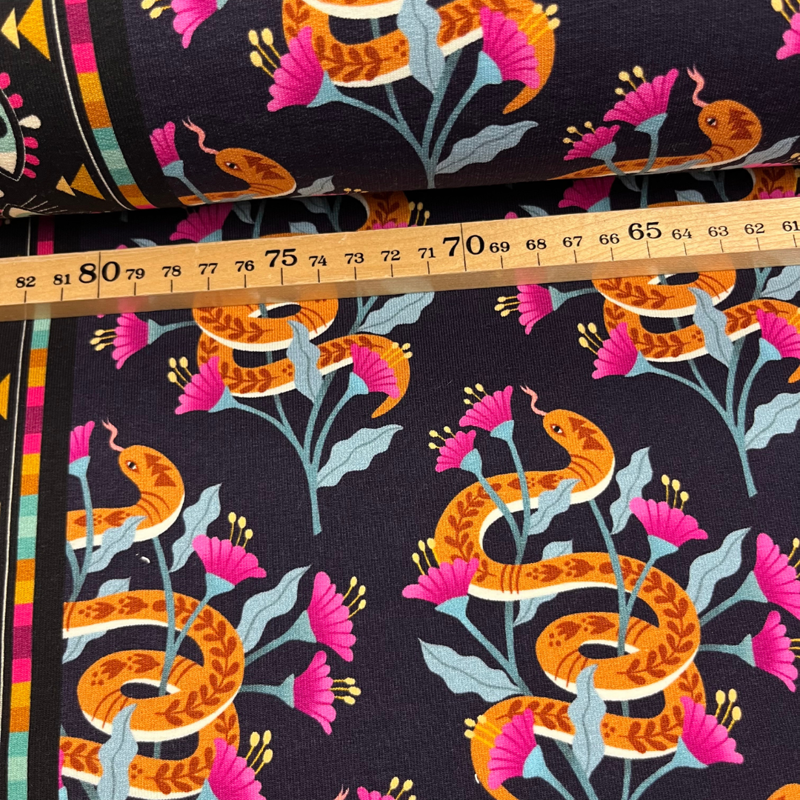 De Magical Shimmer – Of Wisdom is een betoverende sweatstof van AlbStoffe, ontworpen door Hamburger Liebe (Susanne Firmenich). Het dessin met sierlijke slangen en bloemen is modern, krachtig en toch elegant, perfect voor wie van unieke prints houdt.