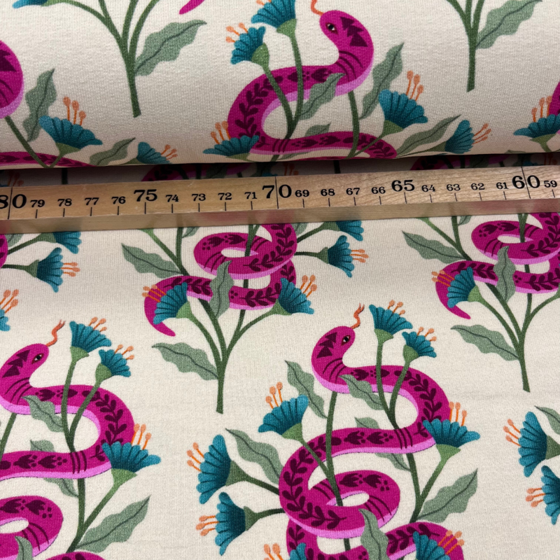 De Magical Shimmer – Of Wisdom is een betoverende sweatstof van AlbStoffe, ontworpen door Hamburger Liebe (Susanne Firmenich). Het dessin met sierlijke slangen en bloemen is modern, krachtig en toch elegant, perfect voor wie van unieke prints houdt.