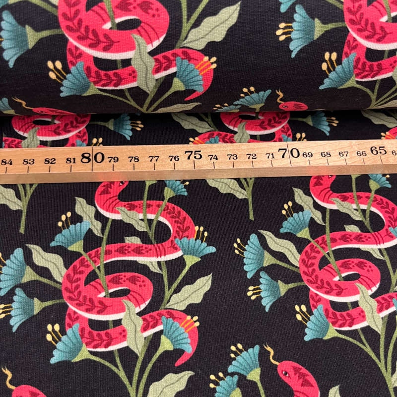 De Magical Shimmer – Of Wisdom is een betoverende sweatstof van AlbStoffe, ontworpen door Hamburger Liebe (Susanne Firmenich). Het dessin met sierlijke slangen en bloemen is modern, krachtig en toch elegant, perfect voor wie van unieke prints houdt.