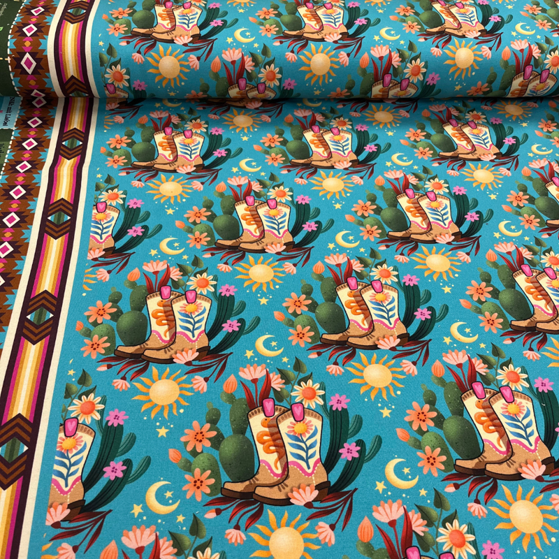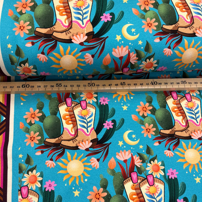 De print barst van energie: laarzen, bloemen, cactussen en maantjes — een speelse mix die perfect past bij iedereen die houdt van unieke en moderne stoffen met karakter. De sweat is heerlijk zacht, heeft een lichte stretch en draagt comfortabel.