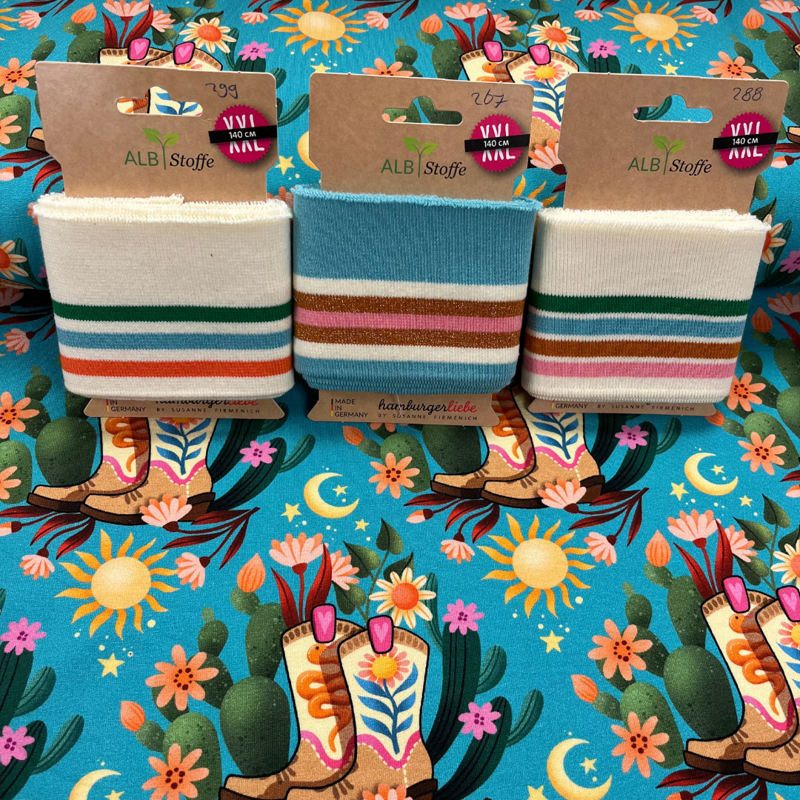 De stoffen uit deze collectie hebben bovendien een leuke randprint aan de zijkant, waarmee je creatieve details kunt toevoegen aan mouwen, zakken of zoom. Combineer met de bijpassende Cuff Me-boordstoffen van ALB Stoffe voor een perfecte afwerking.