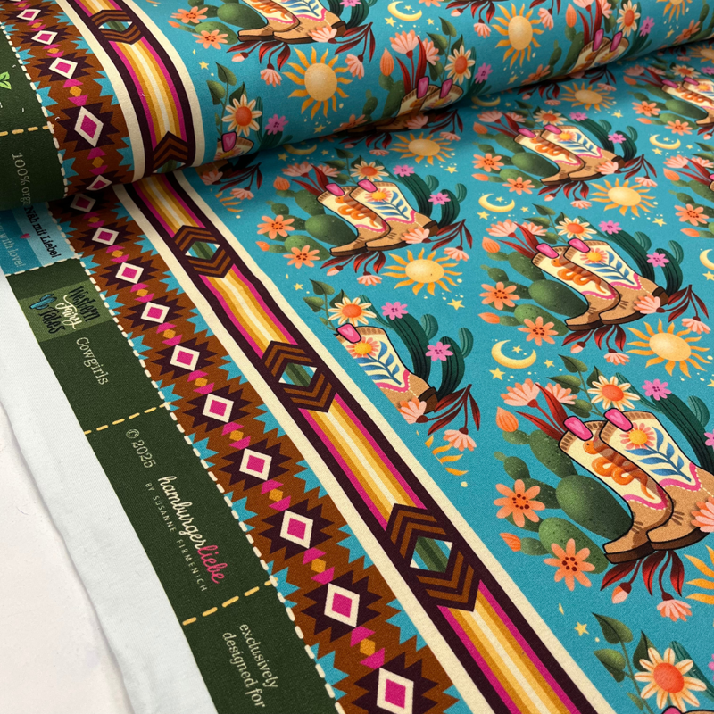 Deze vrolijke sweatstof uit de nieuwste Western Fairy Tales-collectie van Hamburger Liebe, geproduceerd door ALB Stoffe, brengt direct kleur en vrolijkheid in je naaiproject.