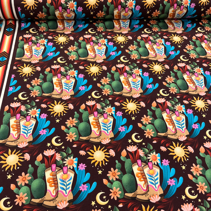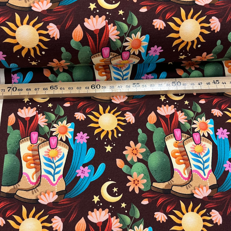 De print barst van energie: laarzen, bloemen, cactussen en maantjes — een speelse mix die perfect past bij iedereen die houdt van unieke en moderne stoffen met karakter. De sweat is heerlijk zacht, heeft een lichte stretch en draagt comfortabel.