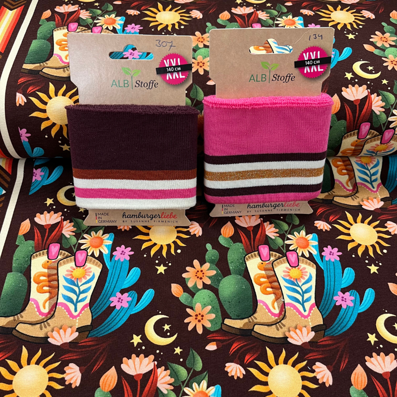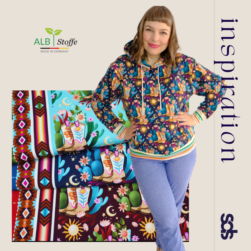 Deze vrolijke sweatstof uit de nieuwste Western Fairy Tales-collectie van Hamburger Liebe, geproduceerd door ALB Stoffe, brengt direct kleur en vrolijkheid in je naaiproject.