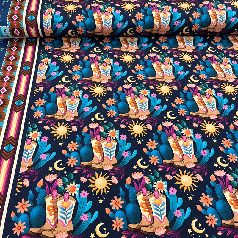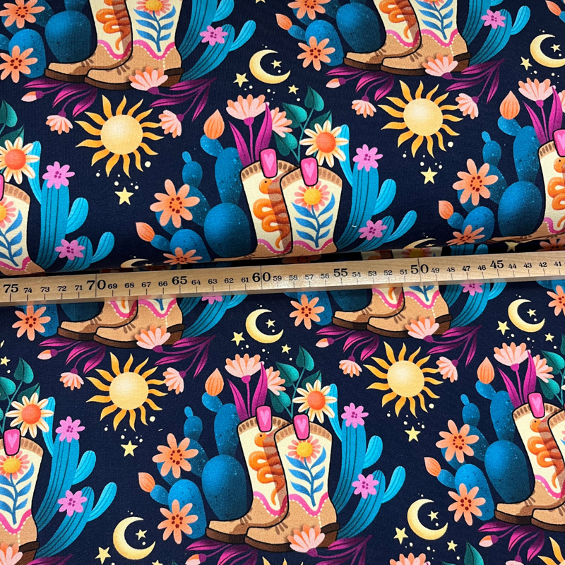 De print barst van energie: laarzen, bloemen, cactussen en maantjes — een speelse mix die perfect past bij iedereen die houdt van unieke en moderne stoffen met karakter. De sweat is heerlijk zacht, heeft een lichte stretch en draagt comfortabel.