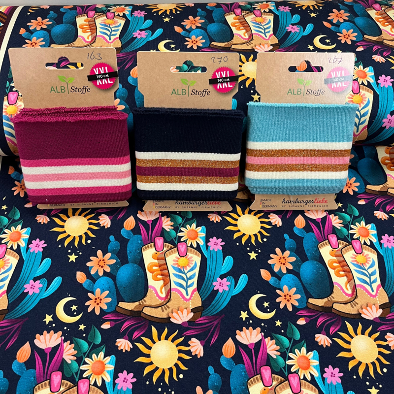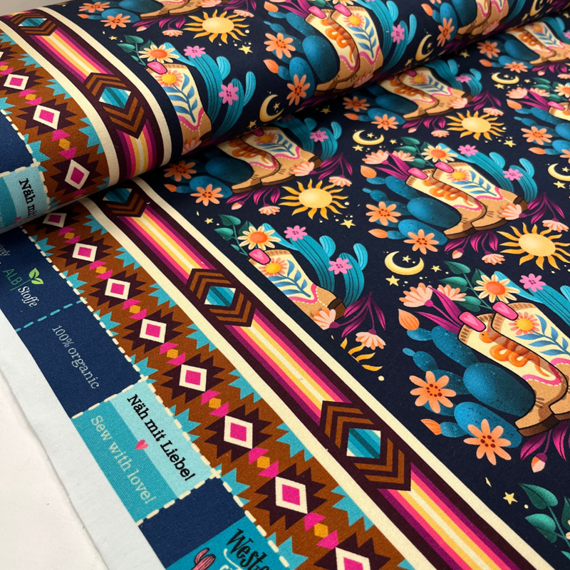 Deze vrolijke sweatstof uit de nieuwste Western Fairy Tales-collectie van Hamburger Liebe, geproduceerd door ALB Stoffe, brengt direct kleur en vrolijkheid in je naaiproject.