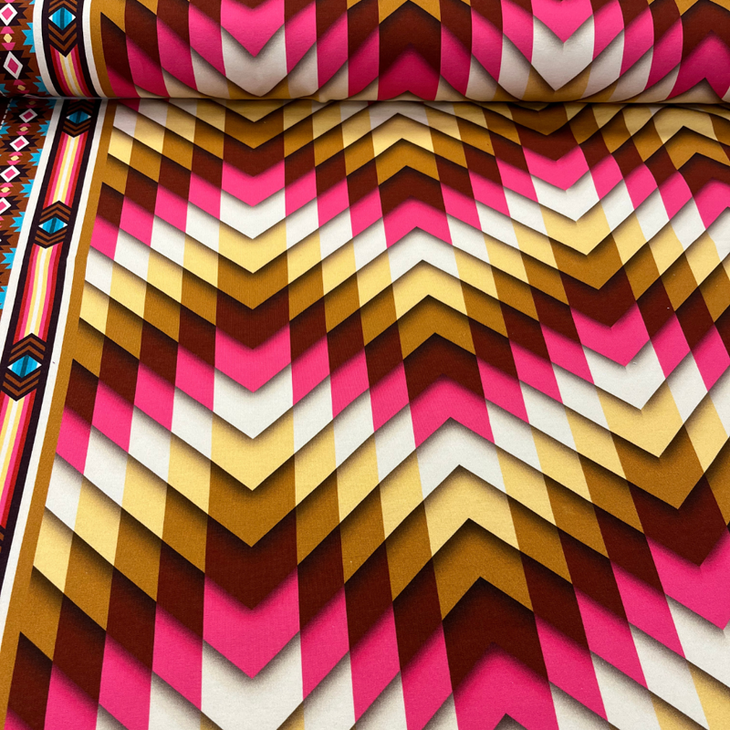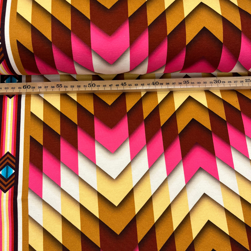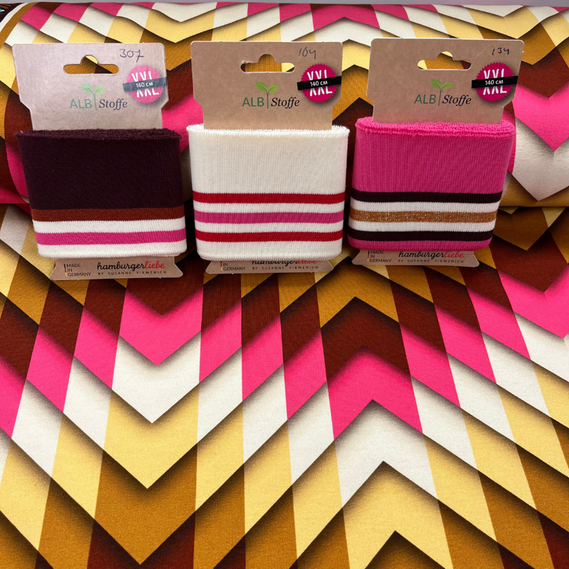 Dankzij het kleurverloop en het ritmische dessin kun je spelen met de richting van de print – perfect voor unieke sweaters, jurken of zelfs een stoer vest. Combineer met de bijpassende Cuff Me-boordstoffen uit dezelfde serie voor een compleet afgewerkte look.