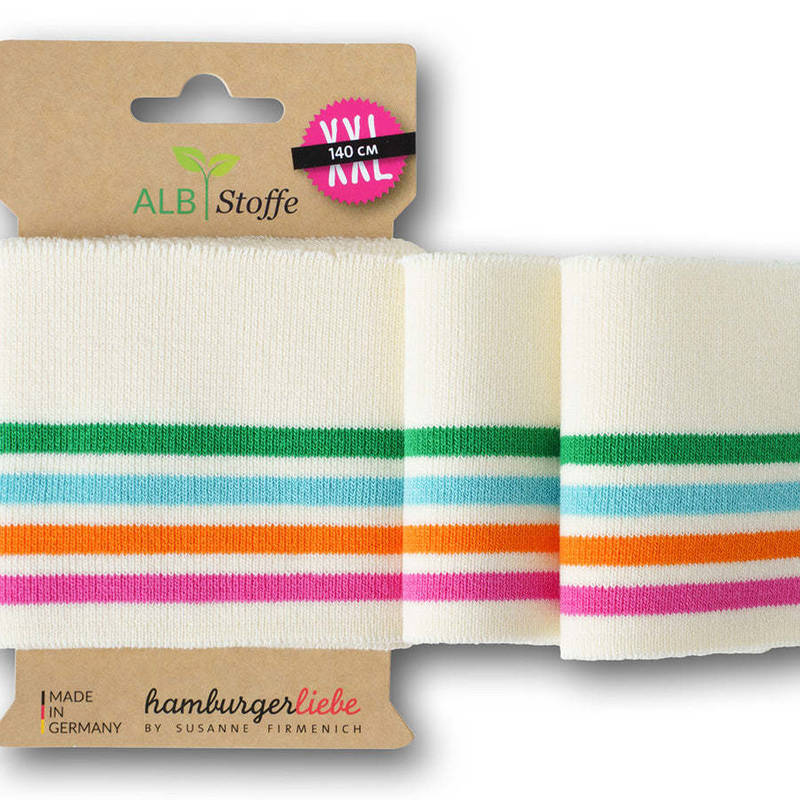 Gebruik ze bijvoorbeeld voor halsboorden, mouwboorden, taillebanden of als zoomafwerking bij sweaters, jassen, jurken en kinderkleding. Dankzij de voorgecoördineerde kleuren en strepen passen ze perfect bij de stoffen uit de Albstoffe collecties, maar ze zijn natuurlijk ook heel mooi te combineren met andere tricot en French terry stoffen.