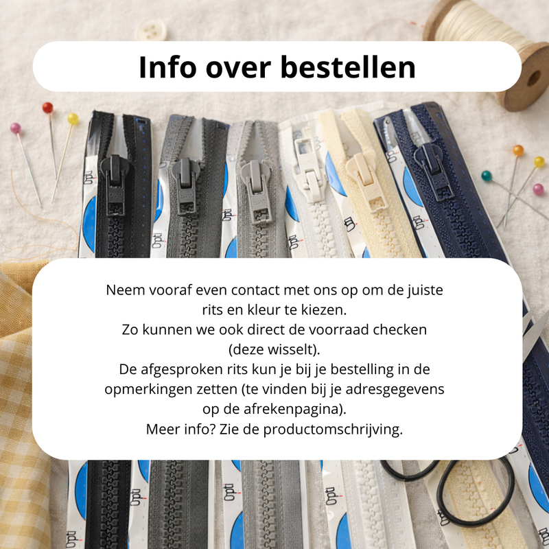 Neem daarom vooraf even contact met ons op om de gewenste kleur en beschikbaarheid af te stemmen. Zo voorkomen we teleurstellingen en zorgen we dat je precies de juiste rits ontvangt.