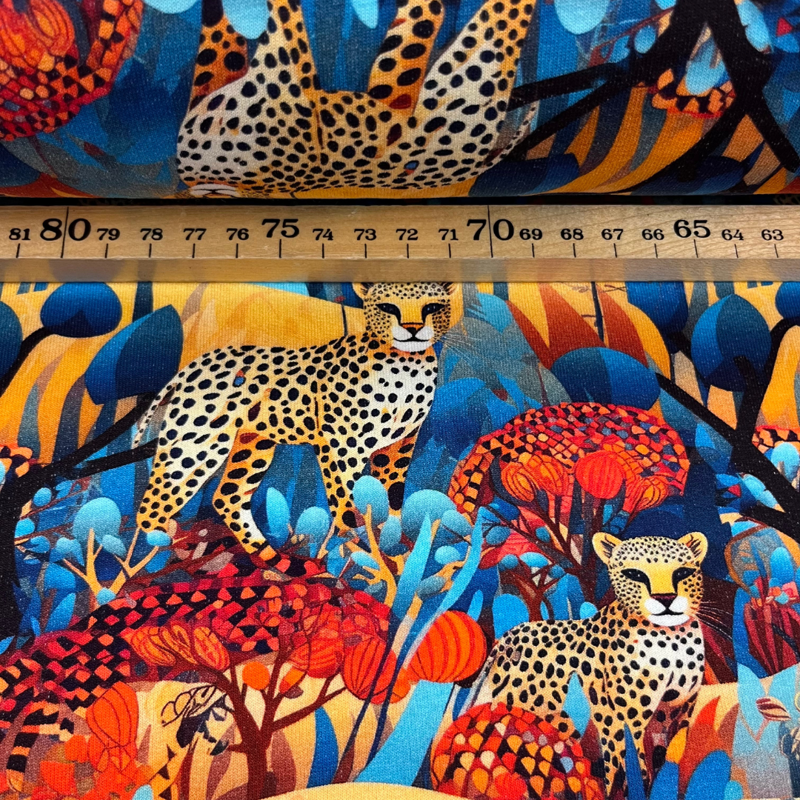De Stenzo French Terry Leopard Dreams is een opvallende en kleurrijke stof uit de Stenzo collectie. Met zijn levendige digitale print van luipaarden in een tropische jungle is dit een echte blikvanger voor je zelfgemaakte kledingstukken.