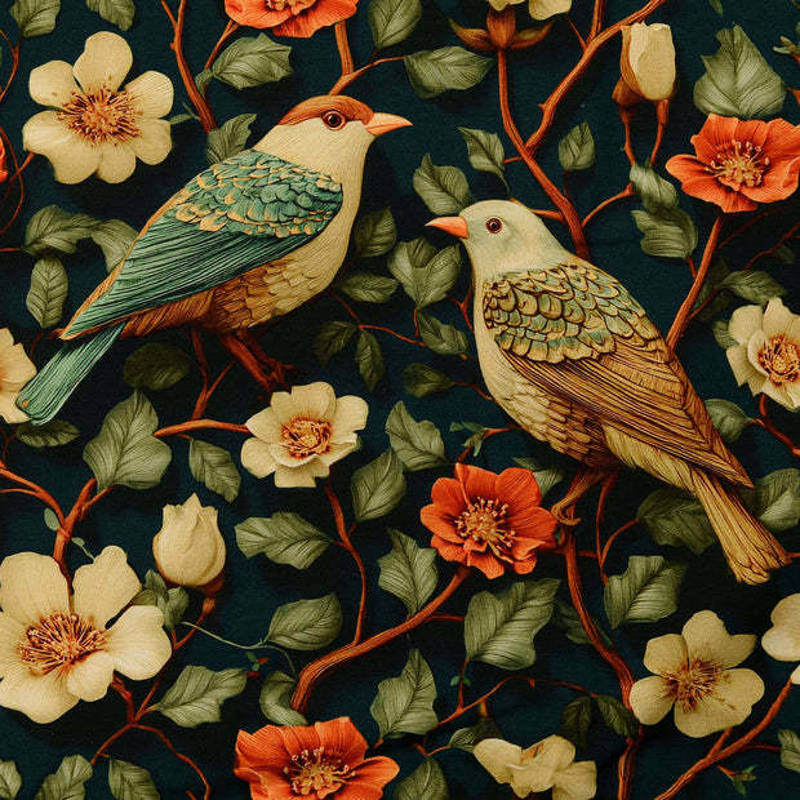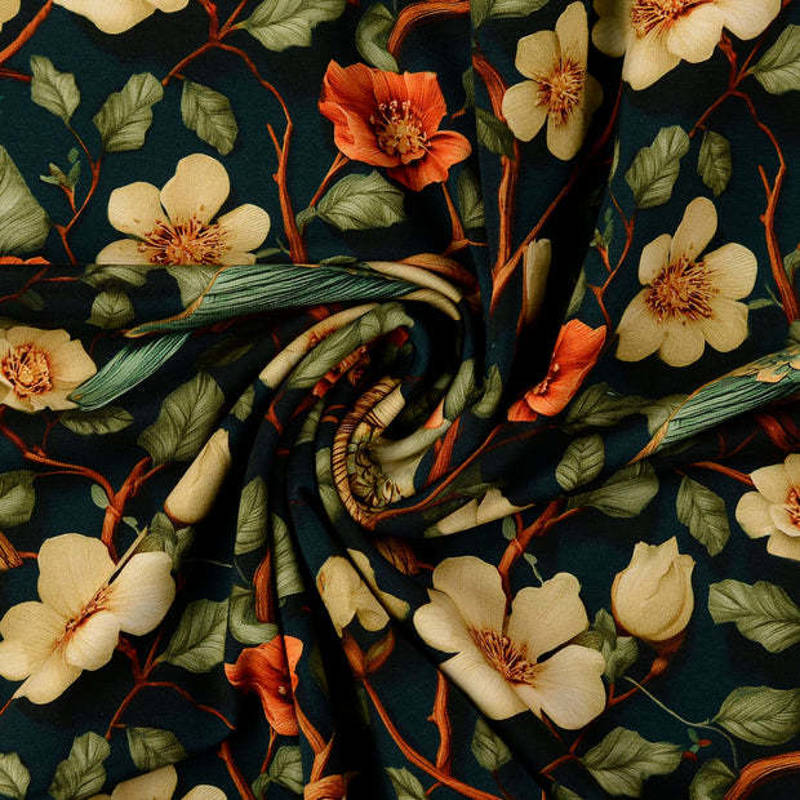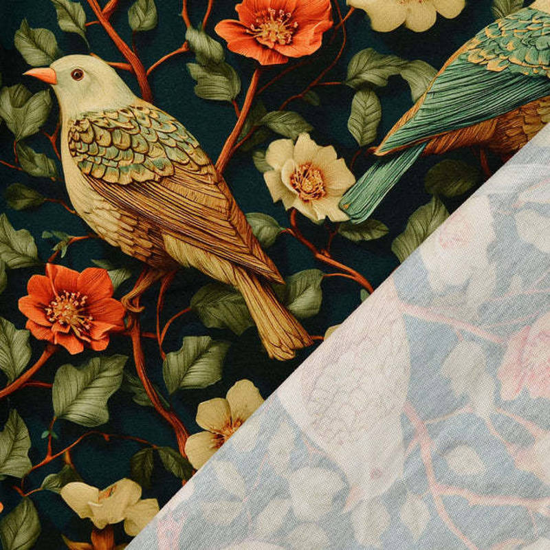 Dankzij het elastan heeft de stof lichte rek, waardoor hij soepel meebeweegt en perfect geschikt is voor kleding die lekker zit én mooi blijft in vorm. De print met vogels en bloesemtakken op een diepe ondergrond geeft elk project een elegante, natuurlijke uitstraling.