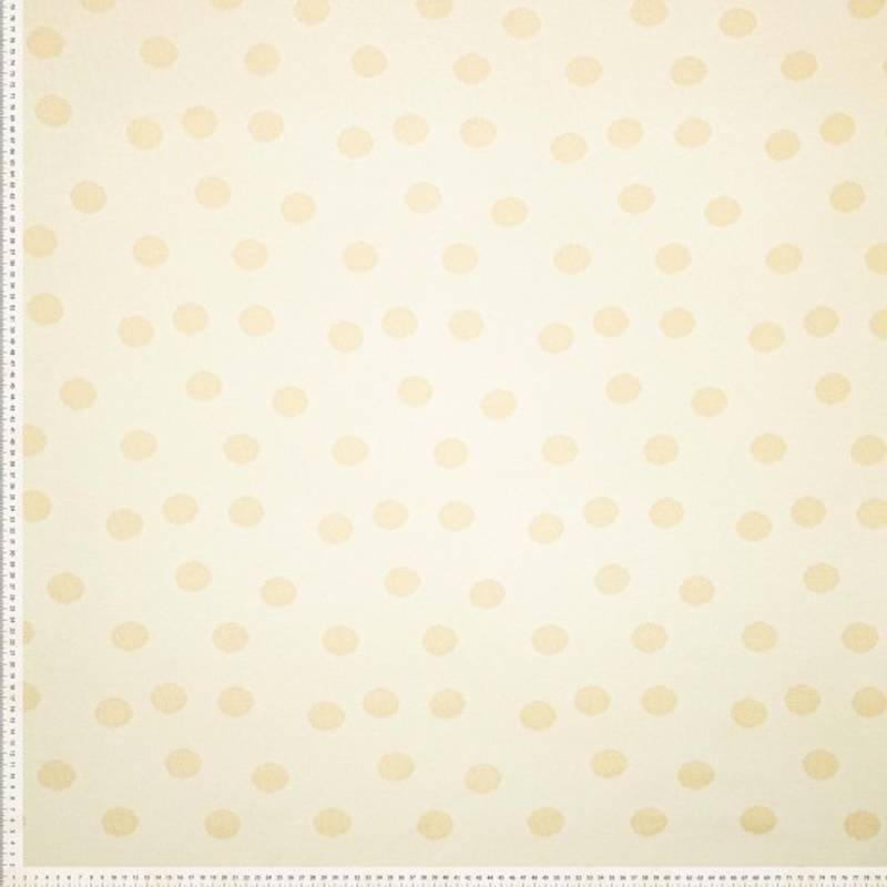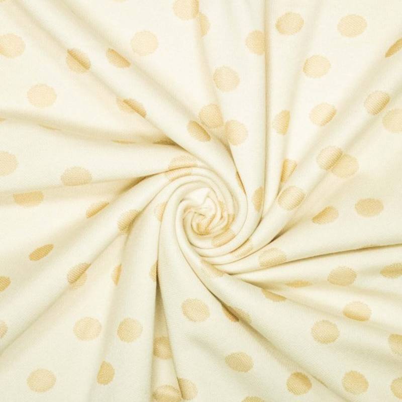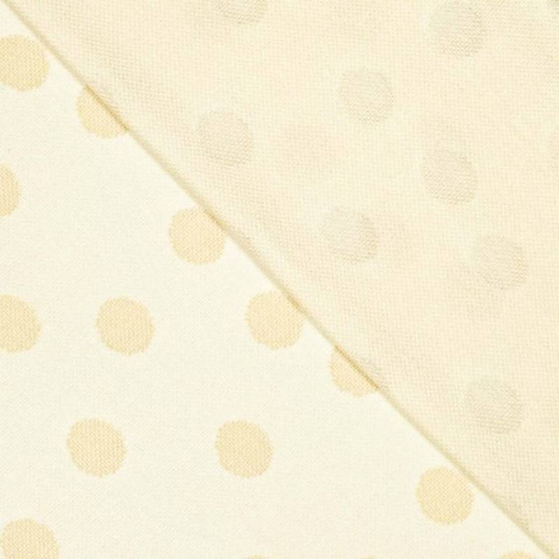 Deze gebreide 100% katoenen jacquard is er eentje waar je meteen vrolijk van wordt. De gebroken witte ondergrond met ingeweven gouden-beige stippen geeft de stof een luxe, speelse uitstraling zonder dat het druk wordt. Omdat de stippen jacquard-geweven zijn, liggen ze subtiel bovenop de stof, wat zorgt voor een mooie structuur en een hoogwaardige look.