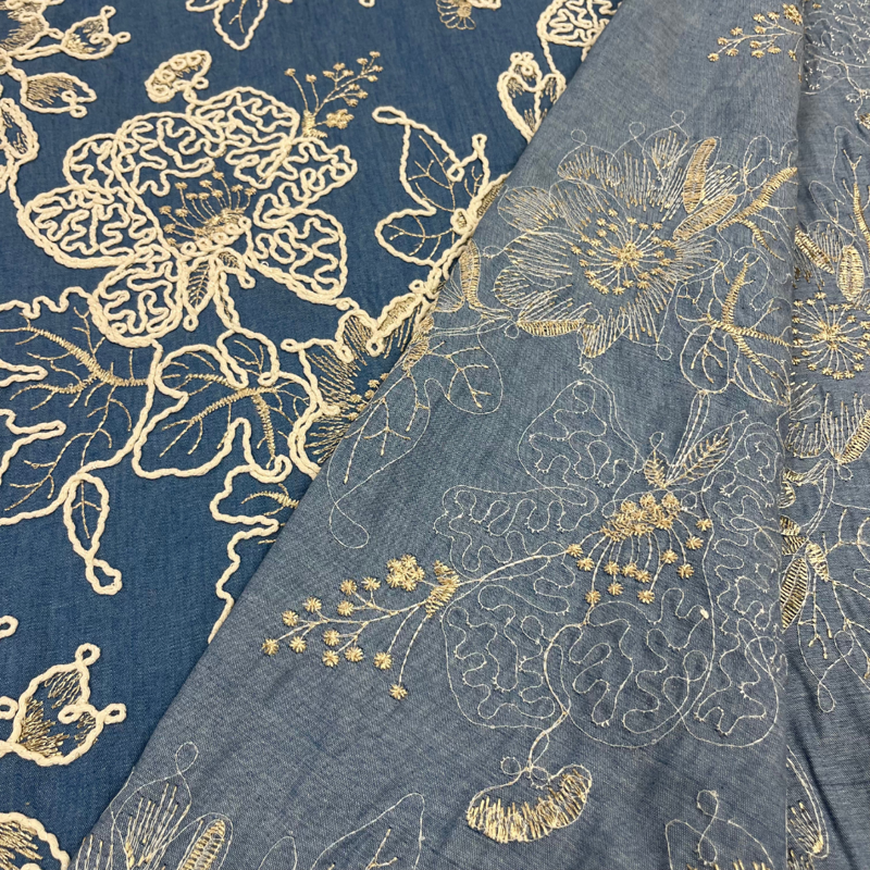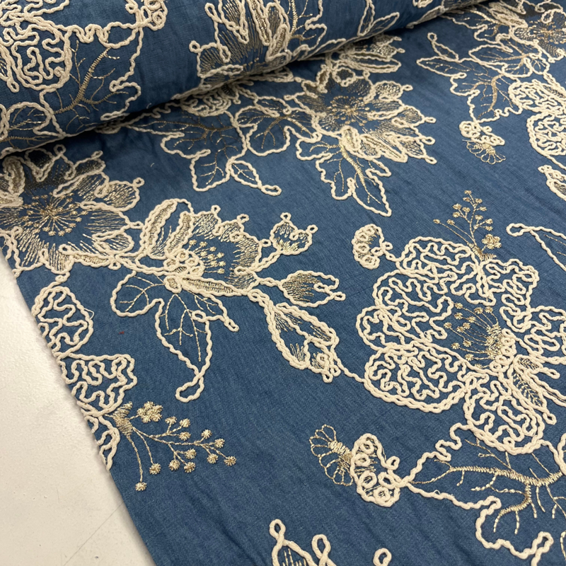 Deze geborduurde katoenen stof in jeanskleur is een ideale keuze voor wie op zoek is naar een bijzondere kledingstof met een luxe uitstraling. De stof heeft de look van denim, maar is géén denim. Het betreft een soepel geweven katoen in een diepblauwe jeanskleur, afgewerkt met een verfijnd bloemenborduursel in een lichte tint. Hierdoor combineert deze stof het stoere karakter van jeans met de zachtheid en draagbaarheid van katoen.