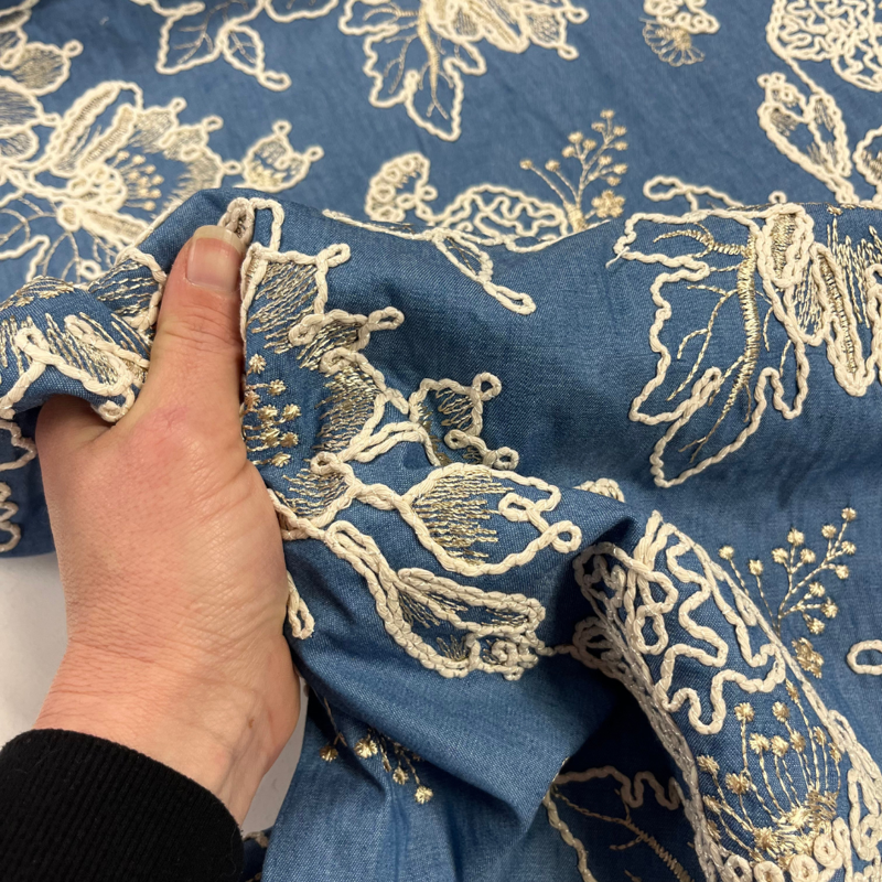 Deze geborduurde katoen in jeanskleur is licht van gewicht en daardoor prettig draagbaar, ook bij grotere kledingstukken zoals een lange rok of een jasje. De stof is zeer geschikt voor zelfmaakmode en wordt veel gekozen door naaisters die op zoek zijn naar een unieke stof voor een statement kledingstuk dat toch tijdloos blijft. De combinatie van katoen en borduursel zorgt ervoor dat de stof zowel casual als gekleed te dragen is.