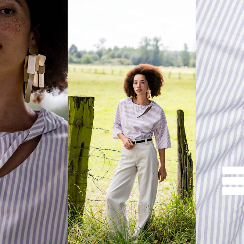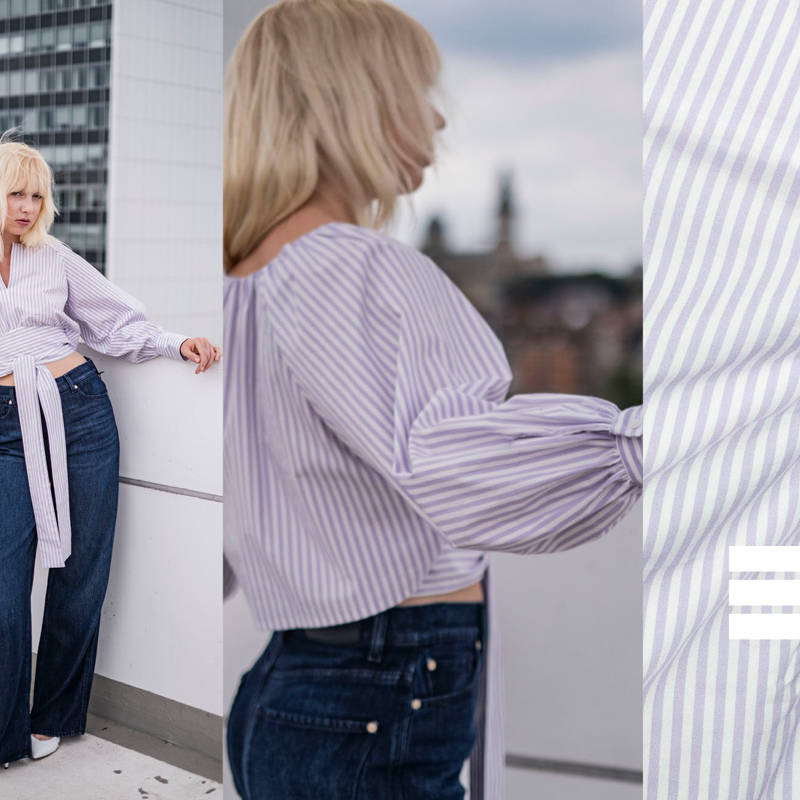 Deze 100% katoenen poplin met lila strepen is een echte zomerse topper. De stof voelt licht en glad aan, zoals je van poplin mag verwachten, en draagt heerlijk luchtig. De fijne structuur en het strakke streepdessin geven elk kledingstuk een frisse, klassieke uitstraling.