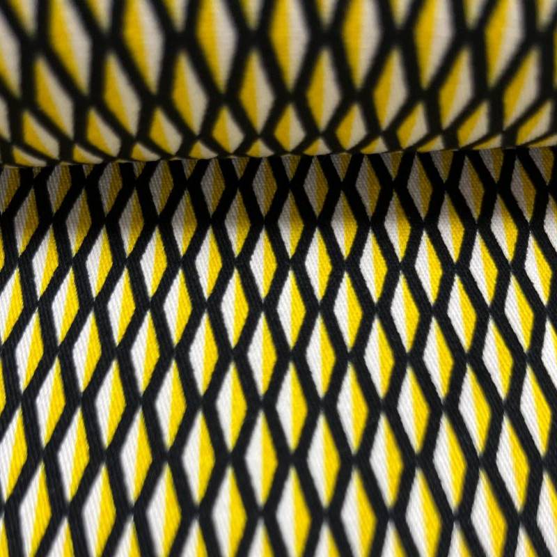 Deze geweven katoenmix heeft een grafisch dessin dat meteen in het oog springt. Het patroon bestaat uit kleine ruitvormen in zwart, wit en fris geel, waardoor de stof een moderne en speelse uitstraling krijgt. Door de stevige maar toch soepelvallende kwaliteit is het een fijne stof voor bijvoorbeeld rokken, broeken, blousjes, gilets, jurken of een luchtige overshirt.