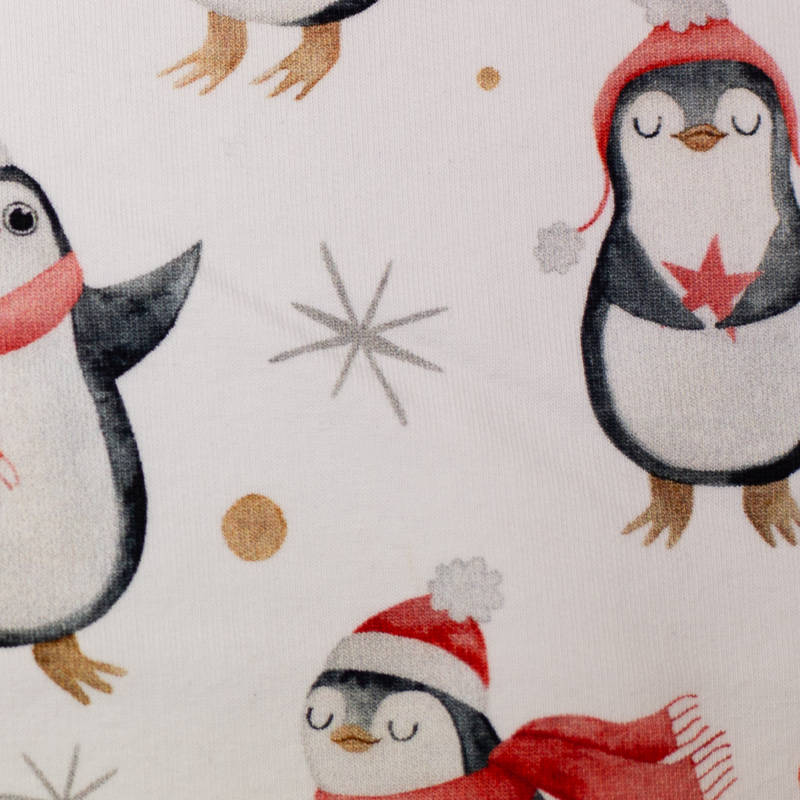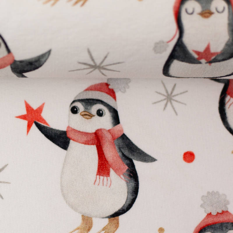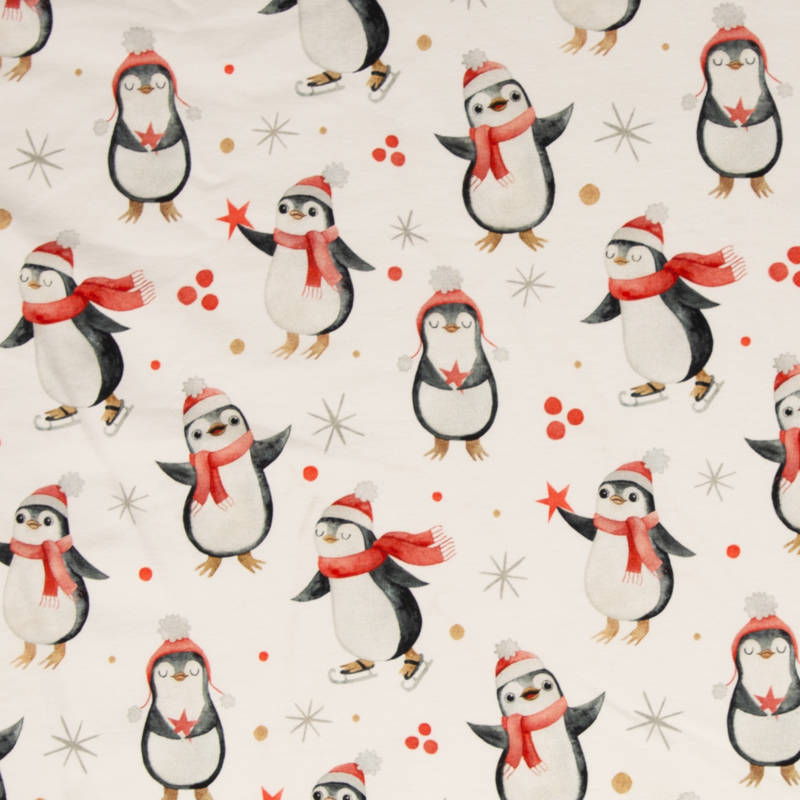 Deze vrolijke French Terry brengt je meteen in de feeststemming! De print met pinguïns in kerstmutsen en sjaals maakt dit een speelse en gezellige stof voor de feestdagen. Perfect voor wie houdt van een grappige en originele kerstoutfit.