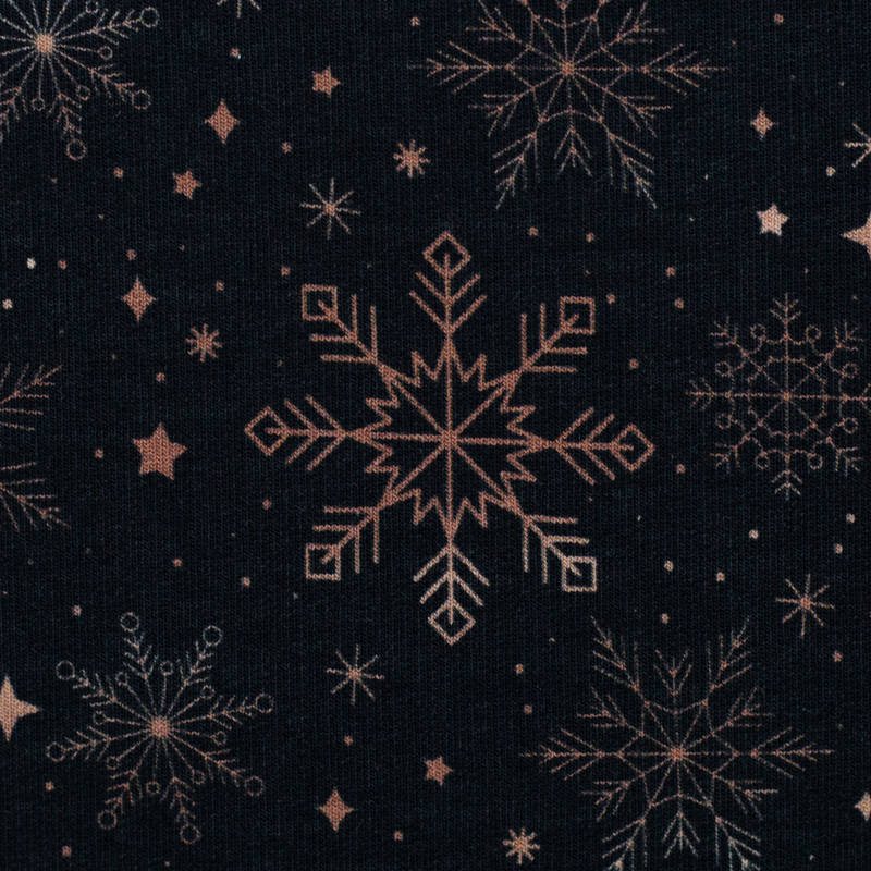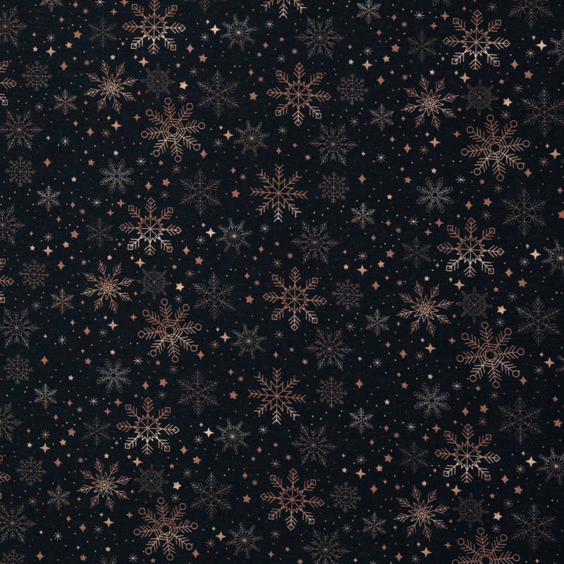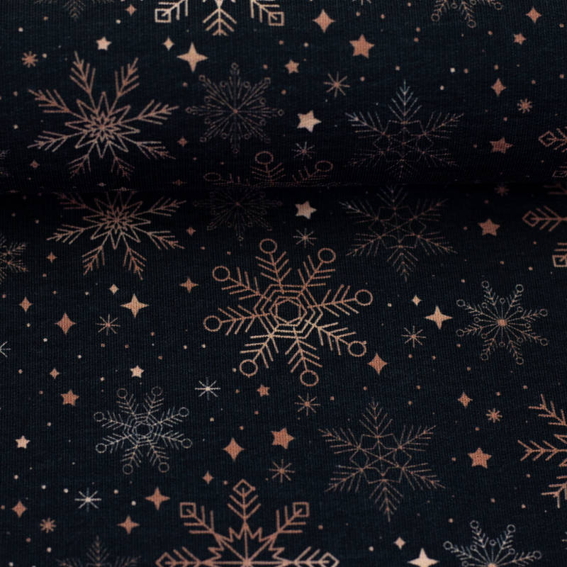 Een sfeervolle kerststof met een elegante uitstraling! Deze French Terry heeft een donkerblauwe basis met koperkleurige sneeuwvlokken en sterretjes. Feestelijk, maar toch subtiel – perfect voor wie een stijlvolle kerstoutfit wil maken.