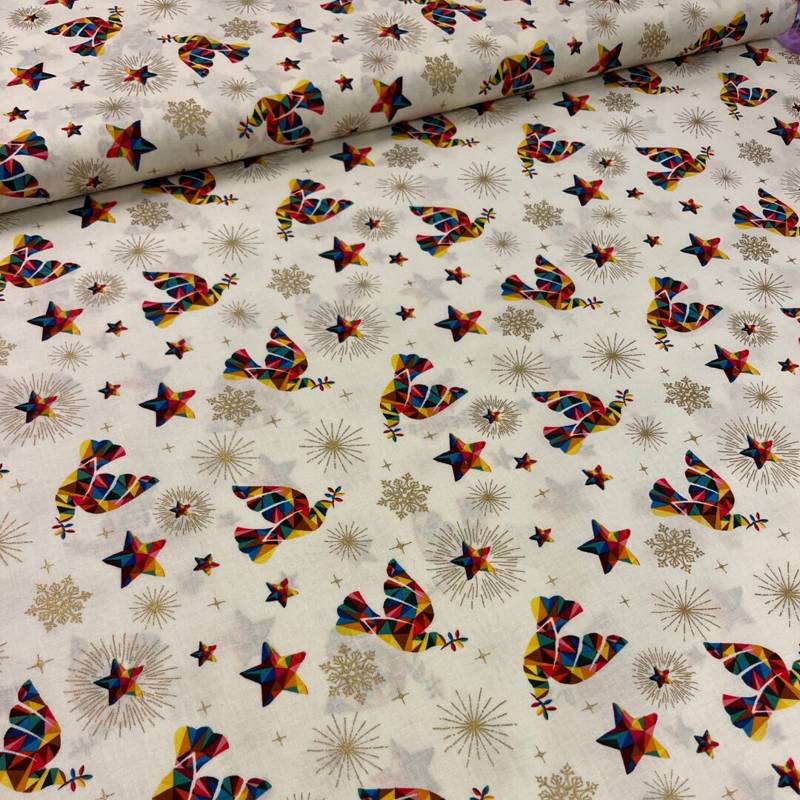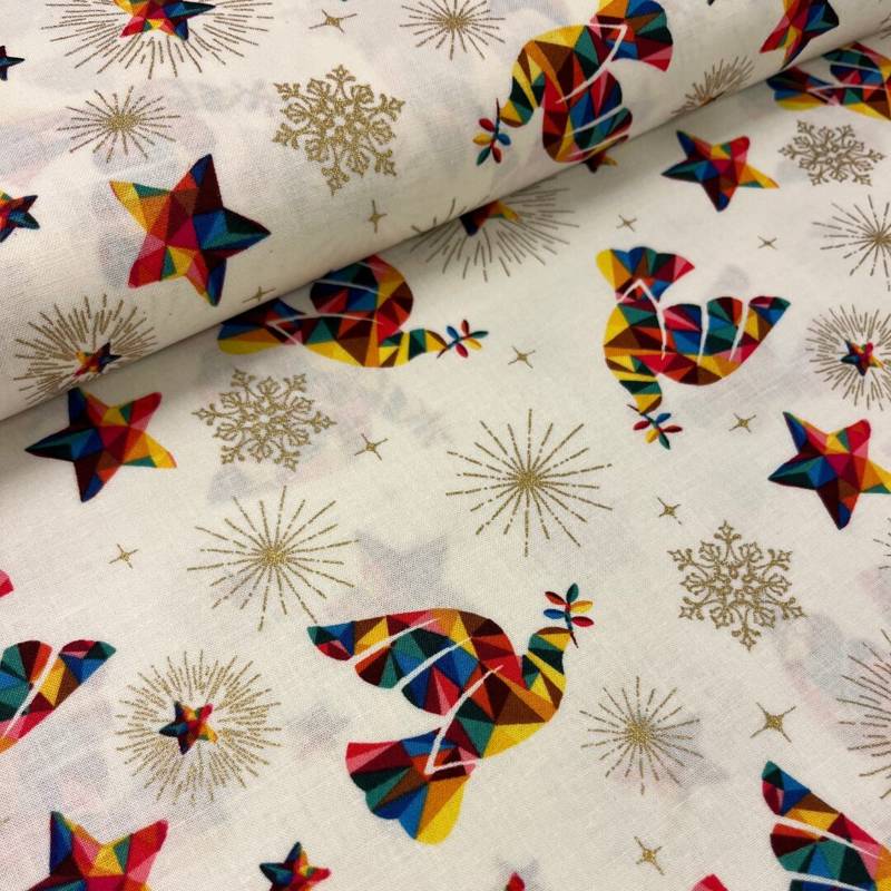 Een feestelijke en stijlvolle kerststof! Deze 100% katoenen stof is bedrukt met een kleurrijk geometrisch dessin van rendieren, sterren en sneeuwvlokken. Door de combinatie van rijke kleuren en gouden accenten krijgt de stof een moderne, luxere uitstraling – perfect voor wie iets bijzonders wil maken voor de feestdagen.