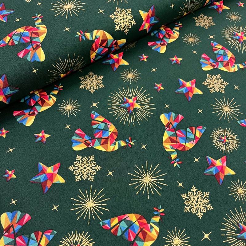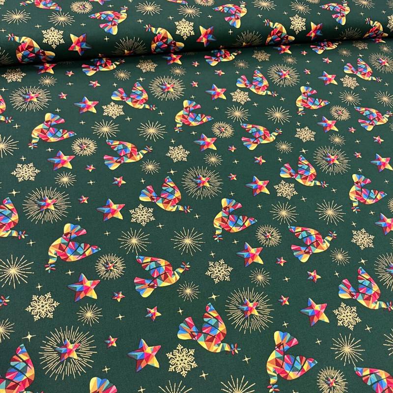 Een feestelijke en stijlvolle kerststof! Deze 100% katoenen stof is bedrukt met een kleurrijk geometrisch dessin van rendieren, sterren en sneeuwvlokken. Door de combinatie van rijke kleuren en gouden accenten krijgt de stof een moderne, luxere uitstraling – perfect voor wie iets bijzonders wil maken voor de feestdagen.