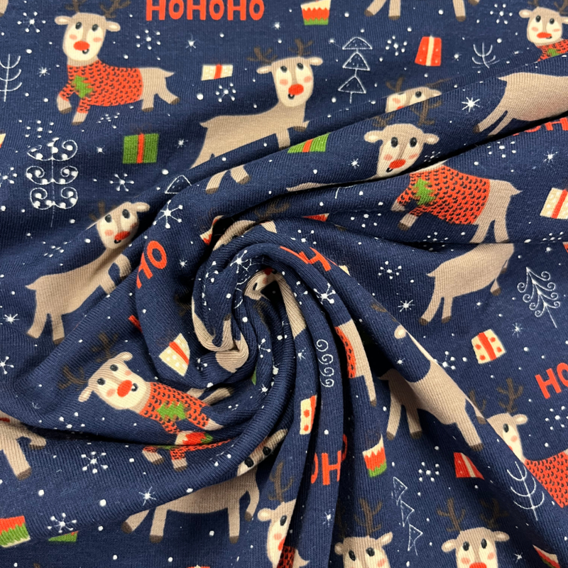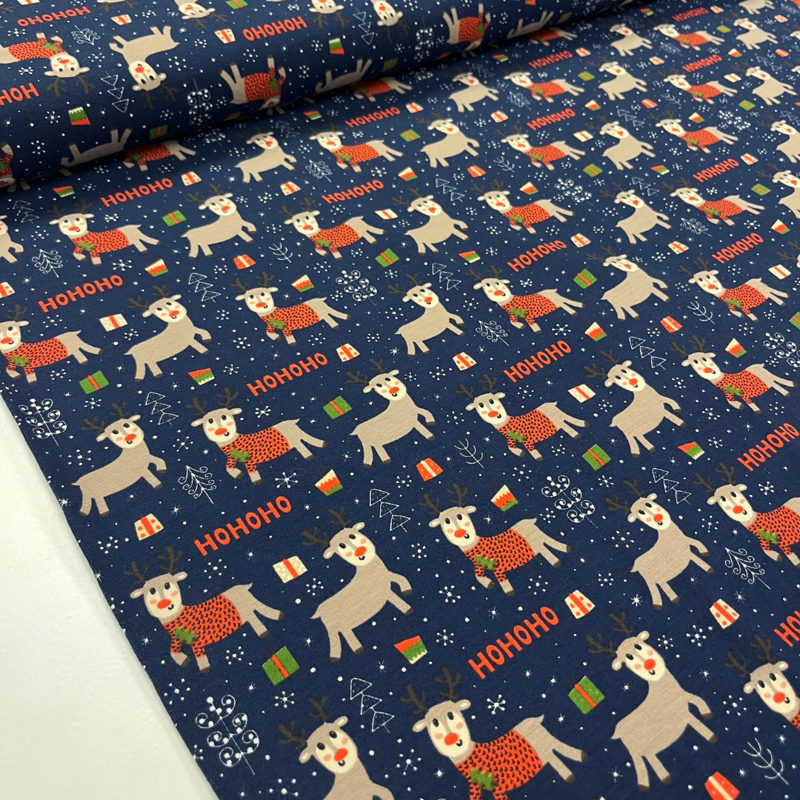 Een vrolijke kerststof waarmee je meteen zin krijgt in de feestdagen! Deze katoen tricot heeft een speelse print met rendieren in kersttruien, sneeuwvlokken en het bekende “HoHoHo”. Perfect voor wie houdt van een grappige en gezellige look.