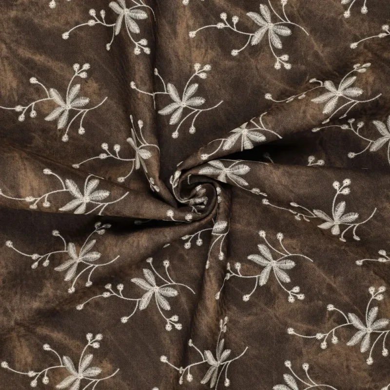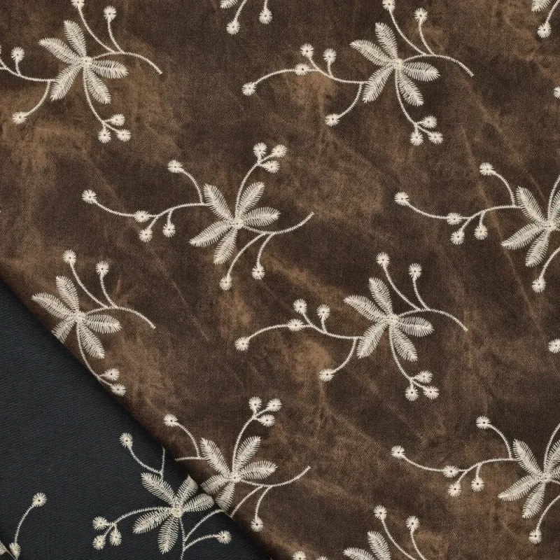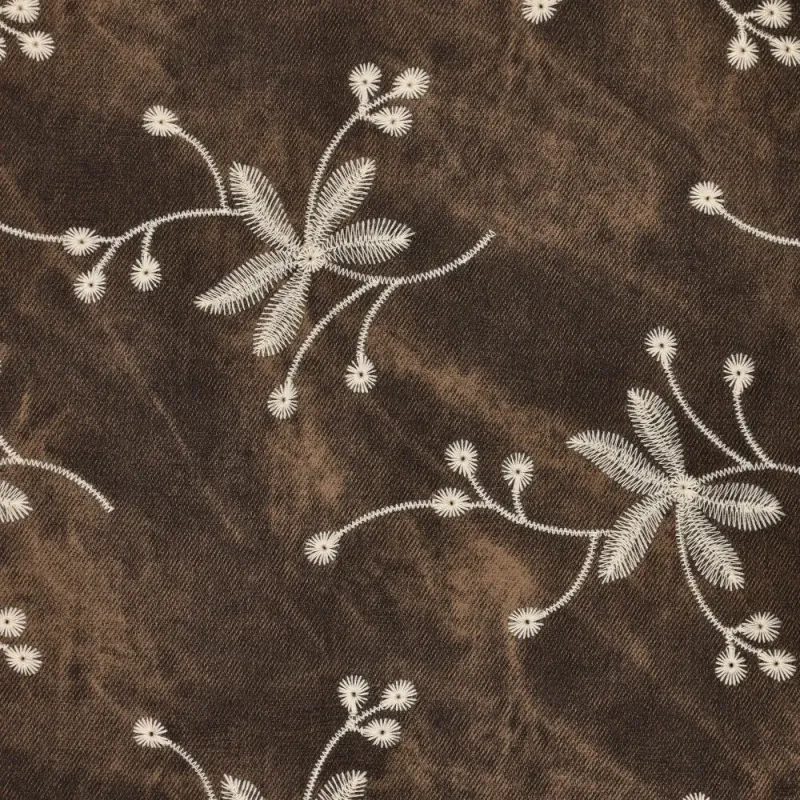 Deze stevige kwaliteit heeft de uitstraling van denim, maar is uitgevoerd in imitatieleer. In combinatie met het rijke borduurwerk ontstaat een bijzonder contrast tussen stoer en verfijnd, met veel diepte en karakter.