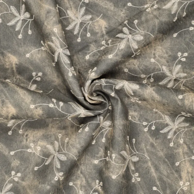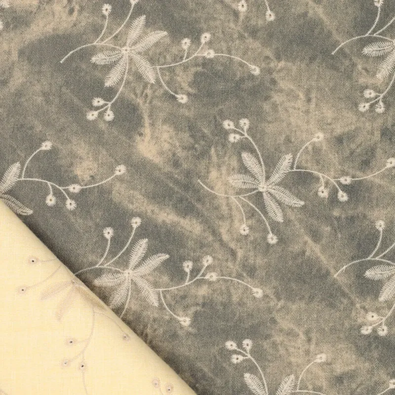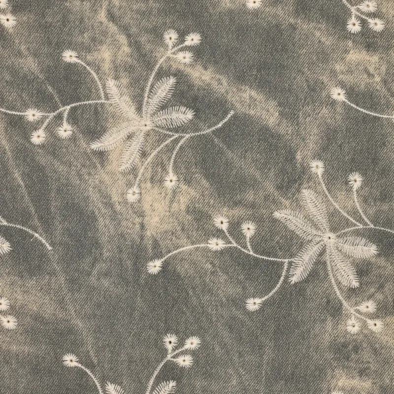 Deze stevige kwaliteit heeft de uitstraling van denim, maar is uitgevoerd in imitatieleer. In combinatie met het rijke borduurwerk ontstaat een bijzonder contrast tussen stoer en verfijnd, met veel diepte en karakter.