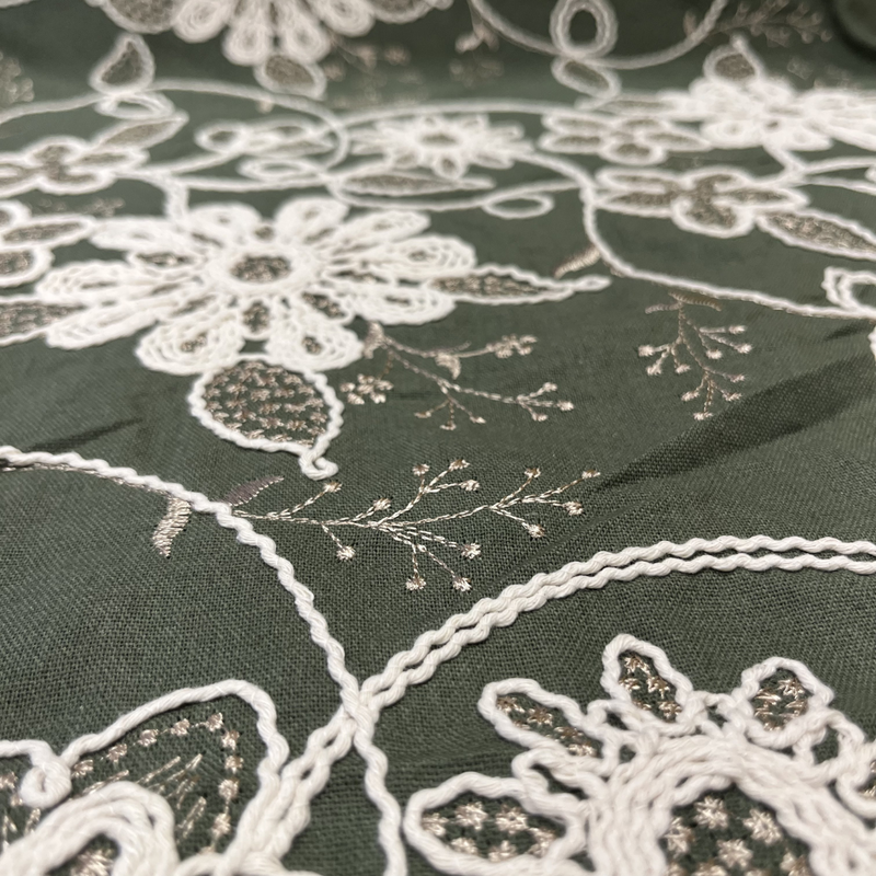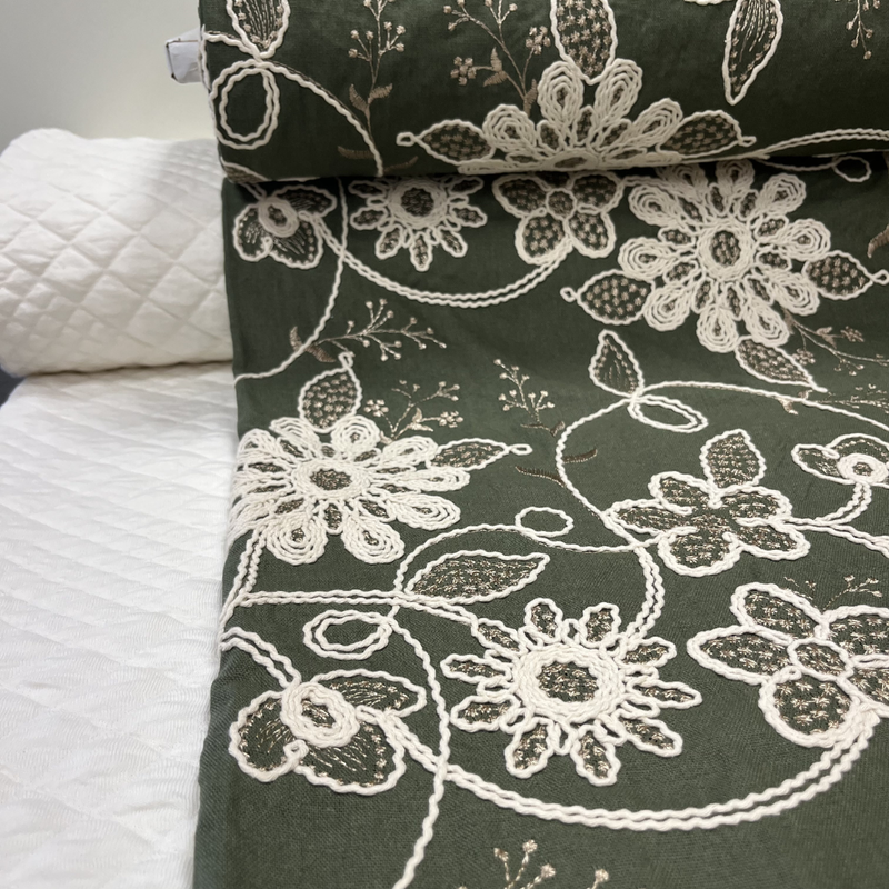 De stof heeft een luxe uitstraling dankzij de verfijnde bloemen en het speelse reliëf van het borduursel. De mix van viscose en linnen zorgt voor een natuurlijke, iets nonchalante look, terwijl de stepper aan de binnenkant juist zachtheid en comfort toevoegt. Samen vormt dit een prachtig contrast: chic aan de buitenkant, comfortabel en warm aan de binnenkant.