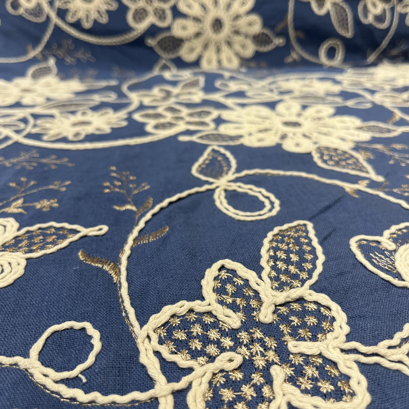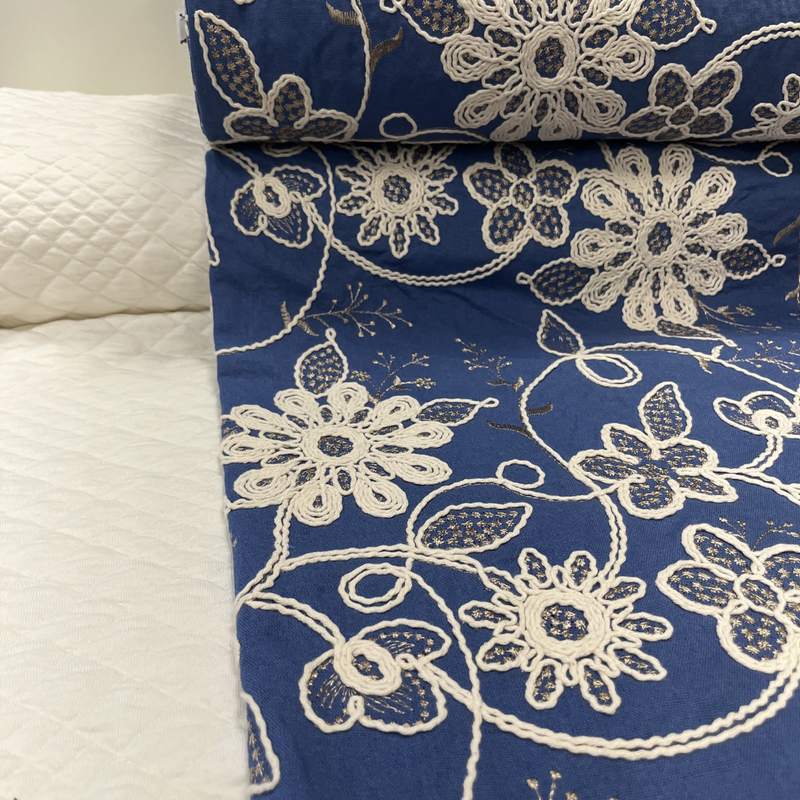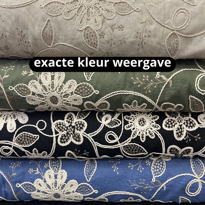 De stof heeft een luxe uitstraling dankzij de verfijnde bloemen en het speelse reliëf van het borduursel. De mix van viscose en linnen zorgt voor een natuurlijke, iets nonchalante look, terwijl de stepper aan de binnenkant juist zachtheid en comfort toevoegt. Samen vormt dit een prachtig contrast: chic aan de buitenkant, comfortabel en warm aan de binnenkant.