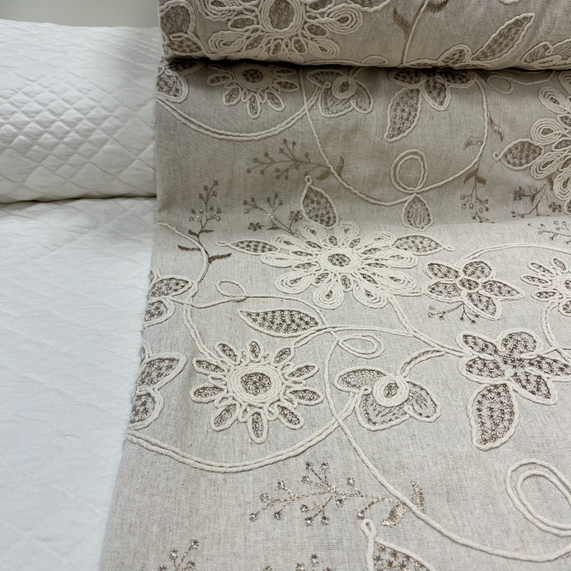 De stof heeft een luxe uitstraling dankzij de verfijnde bloemen en het speelse reliëf van het borduursel. De mix van viscose en linnen zorgt voor een natuurlijke, iets nonchalante look, terwijl de stepper aan de binnenkant juist zachtheid en comfort toevoegt. Samen vormt dit een prachtig contrast: chic aan de buitenkant, comfortabel en warm aan de binnenkant.