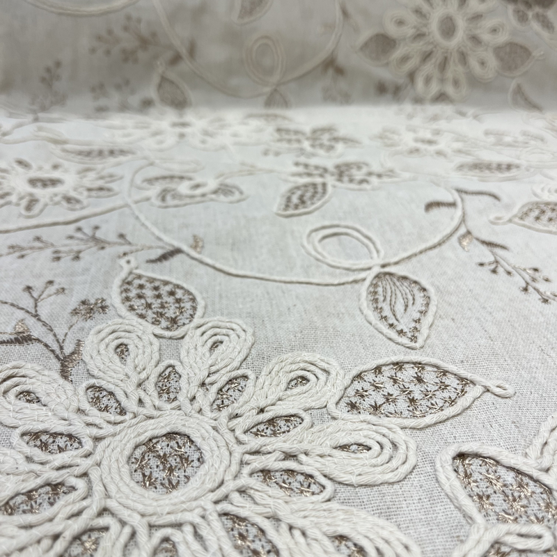 Een stijlvolle combinatie van een rijke, geborduurde stof op een linnen/viscose basis en een zachte, gebroken witte stepper aan de binnenzijde. Warm, verfijnd en verrassend draagbaar.