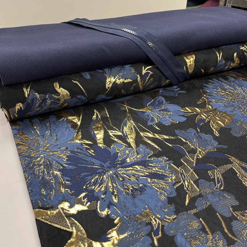 De jacquard is een geweven stof waarbij het dessin in de stof zelf is verwerkt, wat zorgt voor een rijke structuur en extra diepte. De stof geeft het jasje een luxe uitstraling. De bijpassende boordstof en rits zorgen voor een mooi geheel en een rustige afwerking.