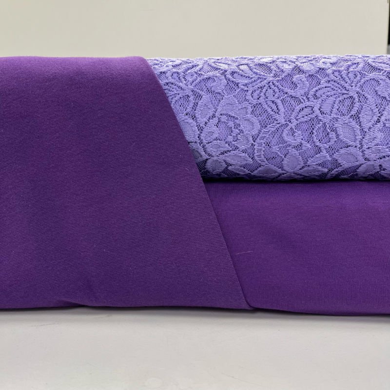 De French Terry vormt de basis van het ontwerp en het kant zorgt voor een chique, modern effect doordat de onderstof subtiel doorschijnt.