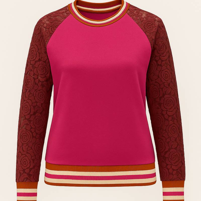 Naaipakket Isa Sweater Fuchsia french terry en bruin kant, maat 32 t/m 40