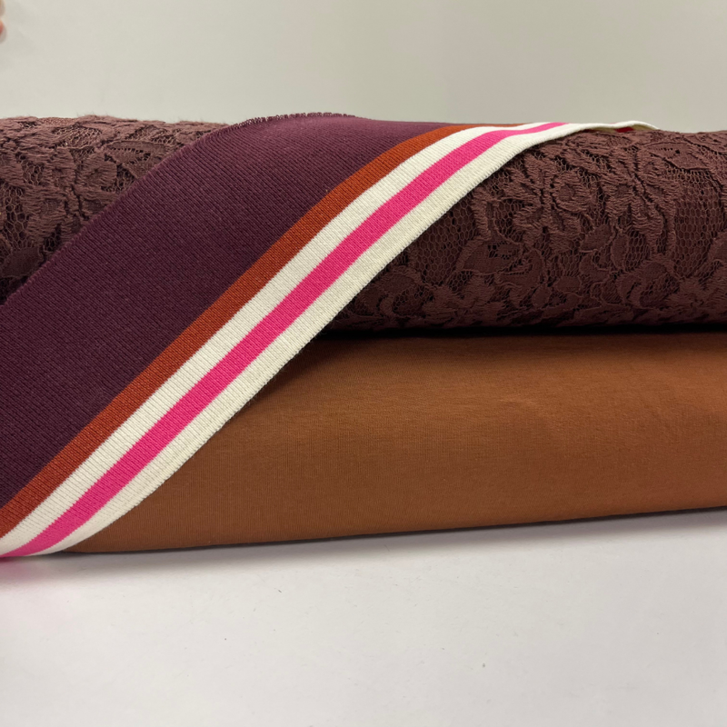 De French Terry vormt de basis van het ontwerp en het kant zorgt voor een chique, modern effect doordat de onderstof subtiel doorschijnt.