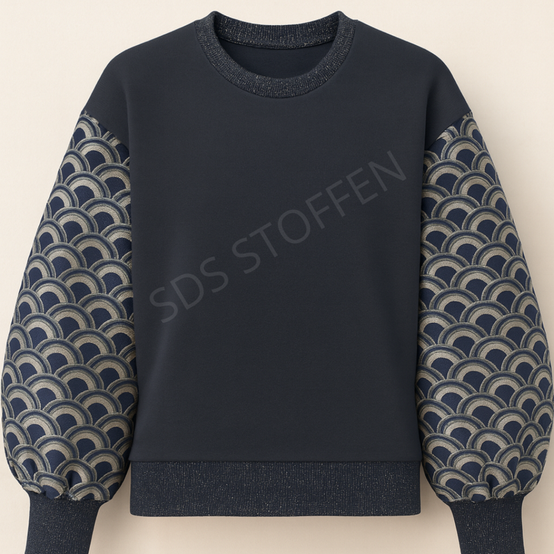 De blauwe punty vormt een prachtige basis voor de jacquard mouwen met zilverkleurige accenten.