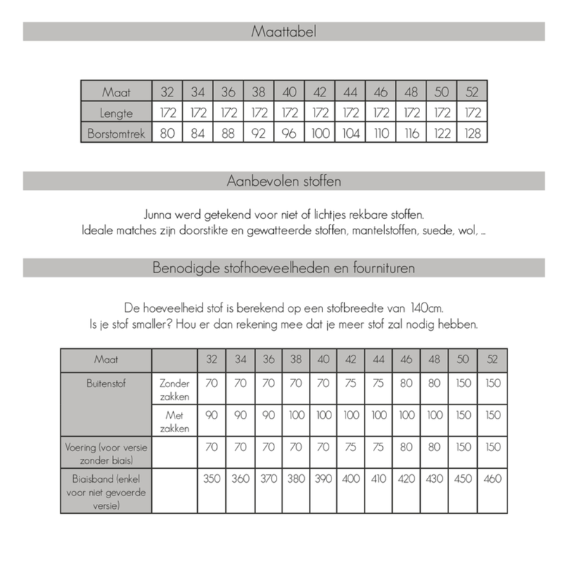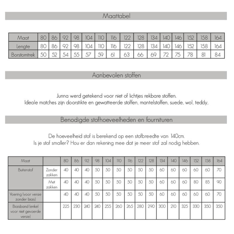 Ideale stoffen voor Junna zijn doorstikte, gewatteerde stoffen, mantelstoffen, corduroy, teddy stoffen, enz.