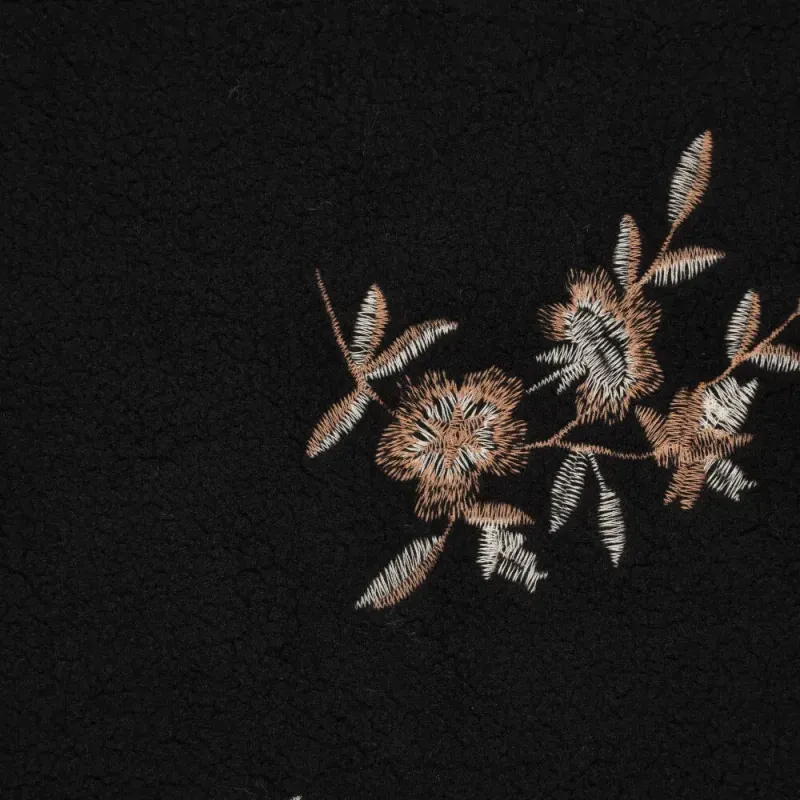 Deze zwarte teddy stof met geborduurde bloemen combineert zachtheid met een luxe uitstraling. De aaibare teddy ondergrond voelt warm en comfortabel aan, terwijl het fijne bloemenborduursel zorgt voor een chique en moderne look. Een perfecte keuze voor stijlvolle winterprojecten.