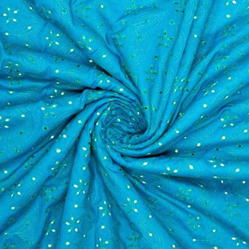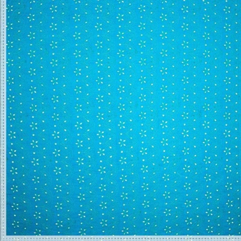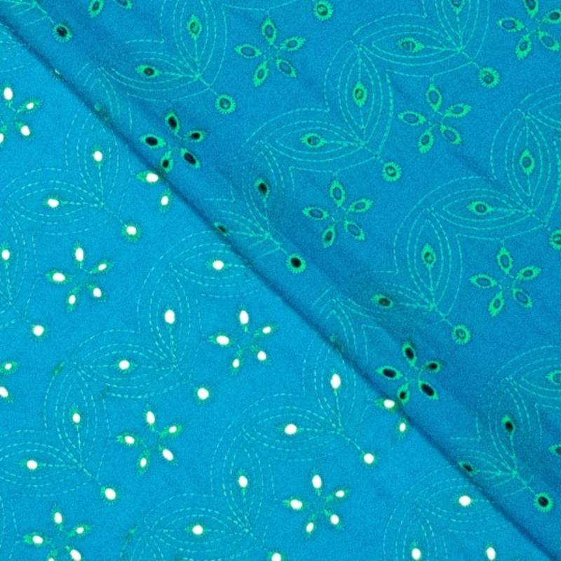 Deze prachtige blauwe broderie is volledig voorzien van een verfijnd, all-over borduursel. De combinatie van de opengewerkte details en de geborduurde bloemen geeft de stof een rijke, speelse uitstraling zonder dat het druk wordt.