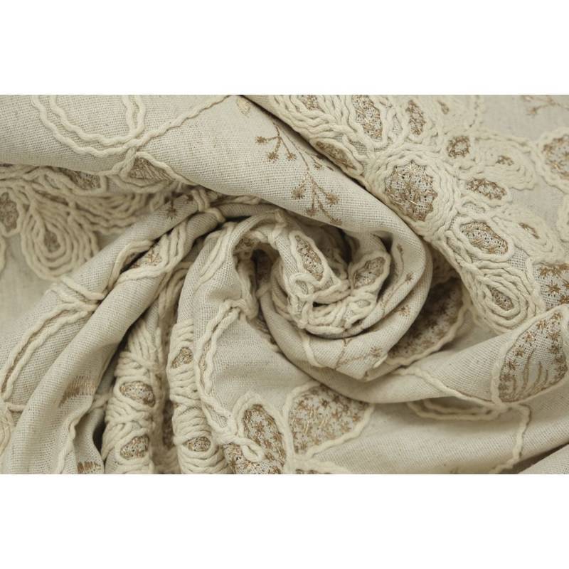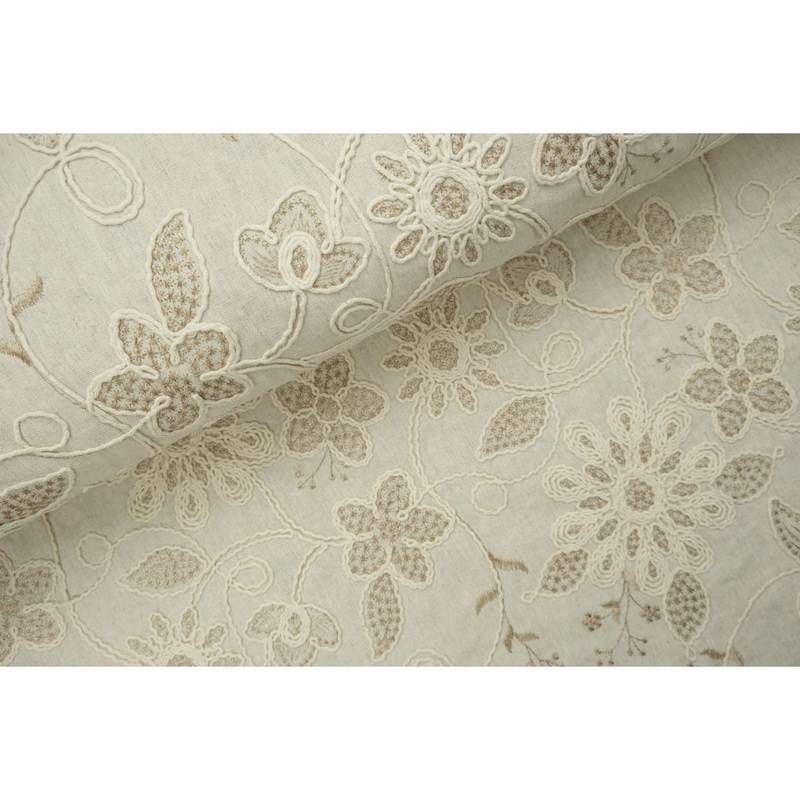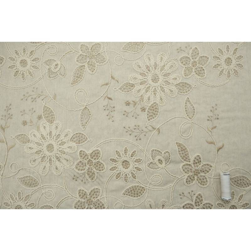 Deze prachtige geborduurde stof heeft een rijke, volle uitstraling door de combinatie van een natuurlijke basis en een uitgesproken borduursel over het hele oppervlak. De structuur geeft direct karakter aan je kledingstuk en zorgt voor een luxe, bijna ambachtelijke look.