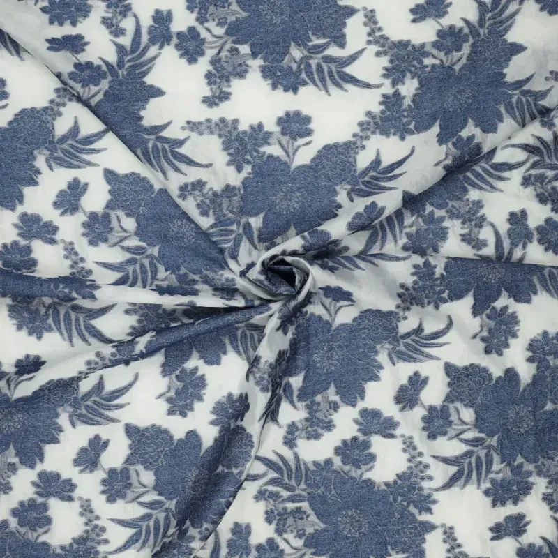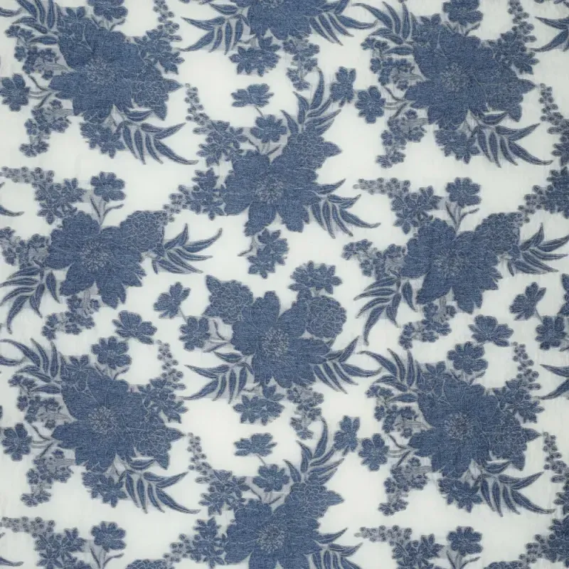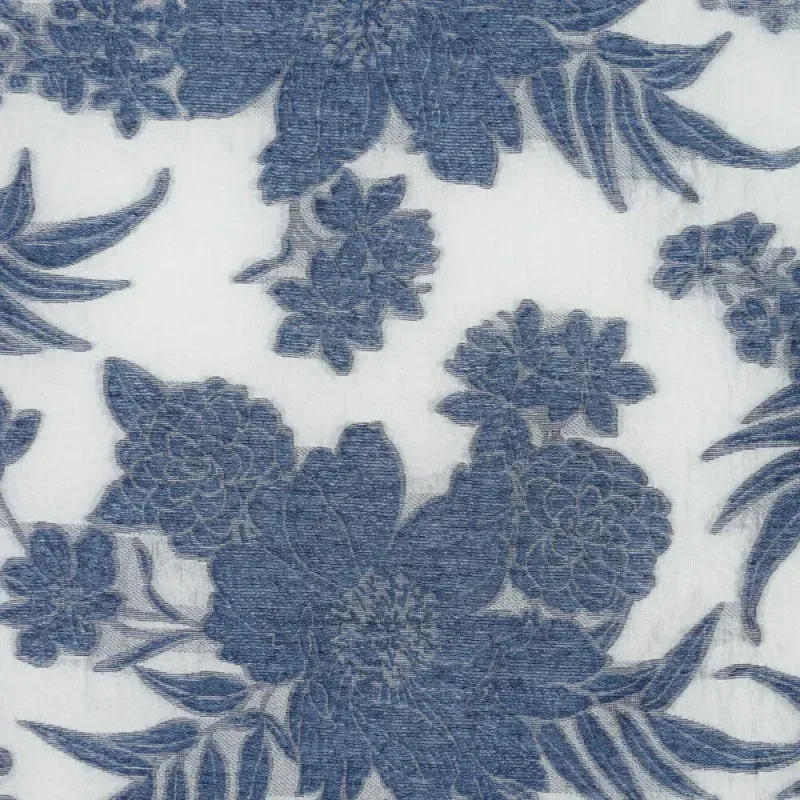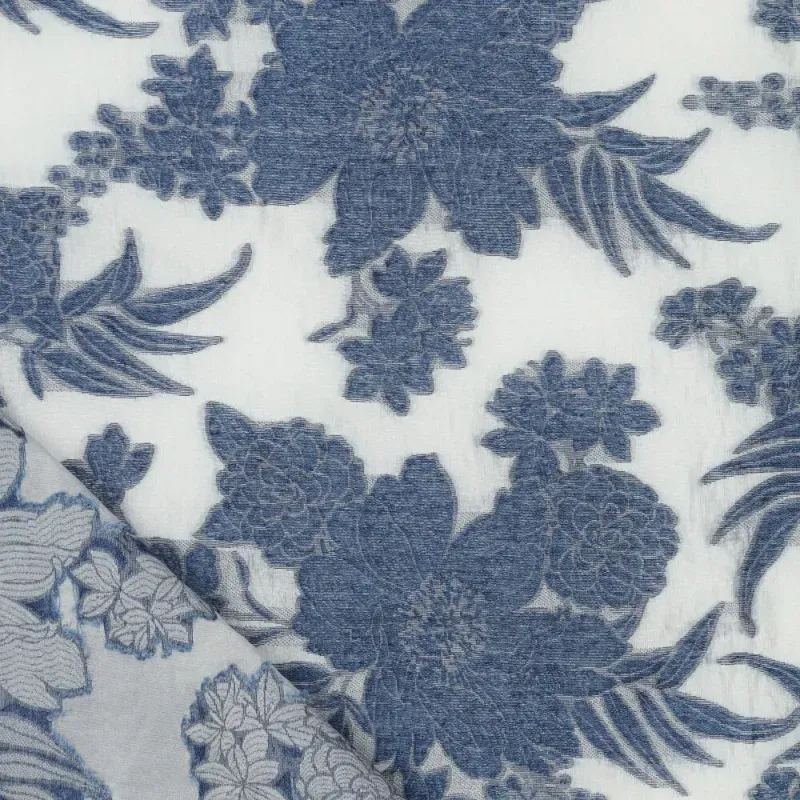 Deze geweven kwaliteit heeft een subtiel transparant karakter en is voorzien van een prachtig bloemenpatroon. Door het burn-out effect ontstaat er een speels contrast tussen de transparante en meer gesloten delen in de stof, wat zorgt voor een rijke en bijzondere uitstraling.