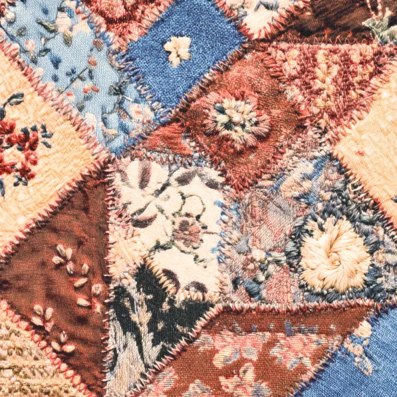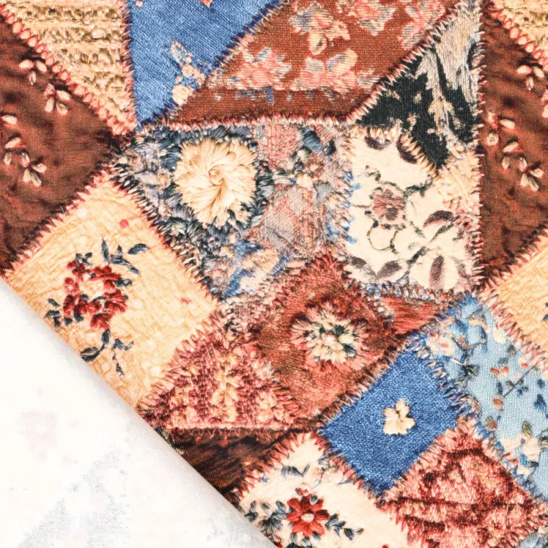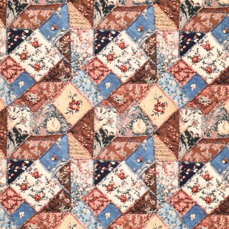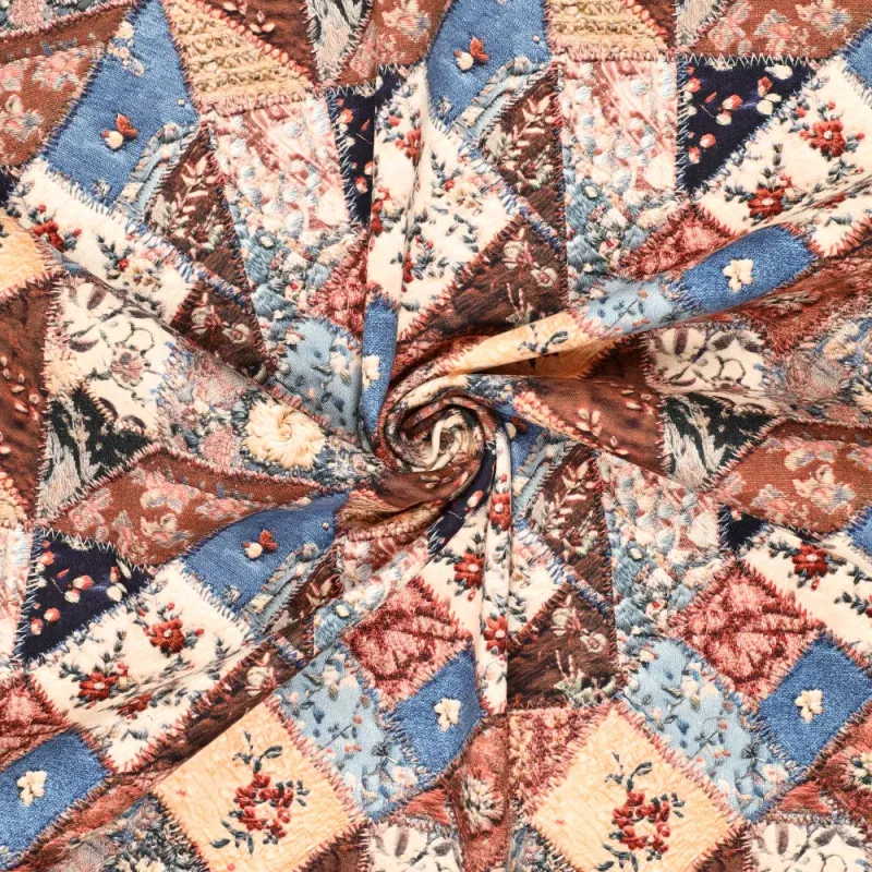 Een denim met karakter. Deze stof heeft een unieke patchwork print waarin verschillende dessins samenkomen: bloemen, ruitjes en klassieke motieven in een warme mix van blauw, roest en naturel tinten.