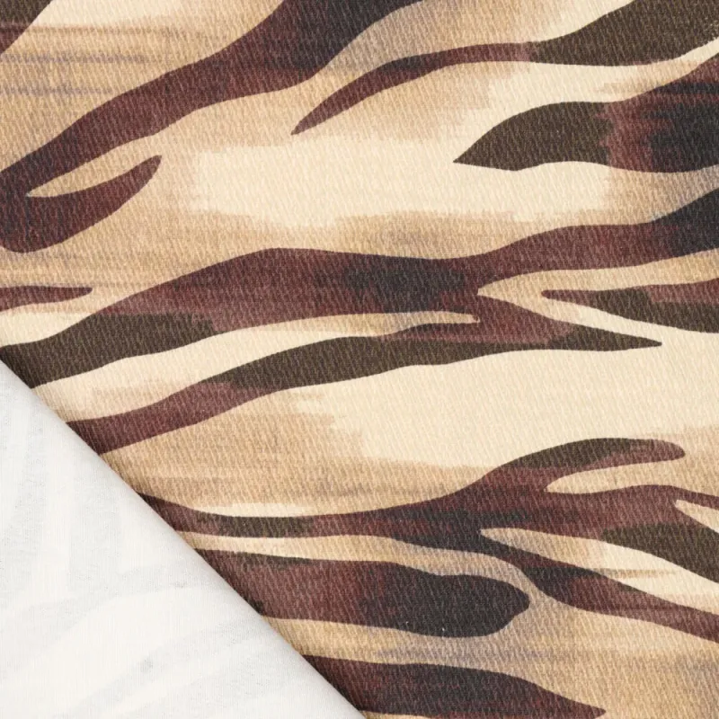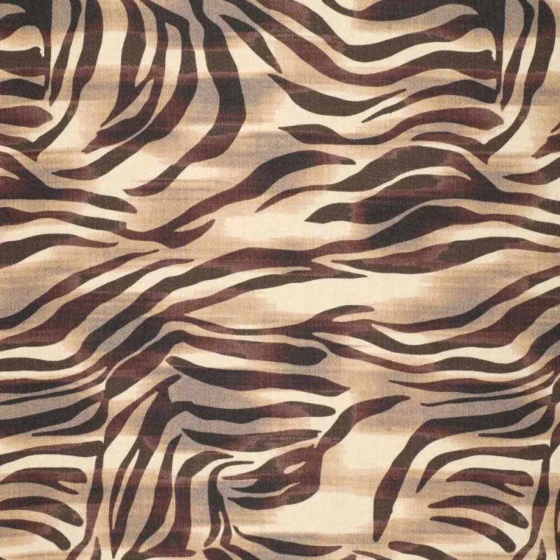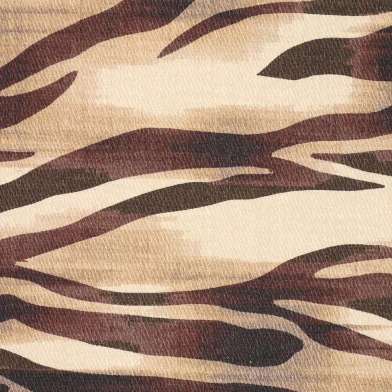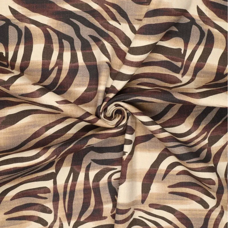Stoer met een zachte twist. Deze denim met zebraprint combineert een speels dessin met warme, natuurlijke tinten zoals bruin, beige en zand. De print geeft een krachtige uitstraling, terwijl de kleuren juist rust en zachtheid brengen.