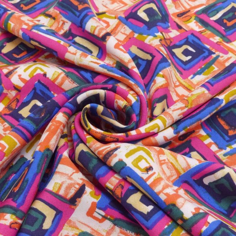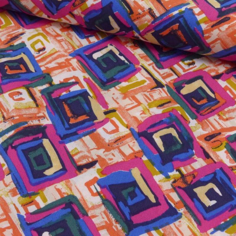 Deze prachtige viscose stof springt direct in het oog door de speelse grafische print en het rijke kleurenpalet. De combinatie van warme oranjetinten met blauw, roze en groen geeft de stof een creatieve, bijna handgeschilderde uitstraling. Echt zo’n stof waar je meteen ideeën van krijgt zodra je hem ziet.