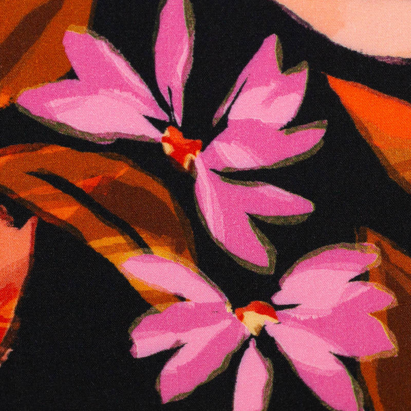 De levendige tinten oranje, roze, fuchsia en geel geven je creatie een vrolijke en zomerse uitstraling. Dankzij de zachte, natuurlijke vezel voelt de stof comfortabel aan op de huid en beweegt hij soepel met je mee.