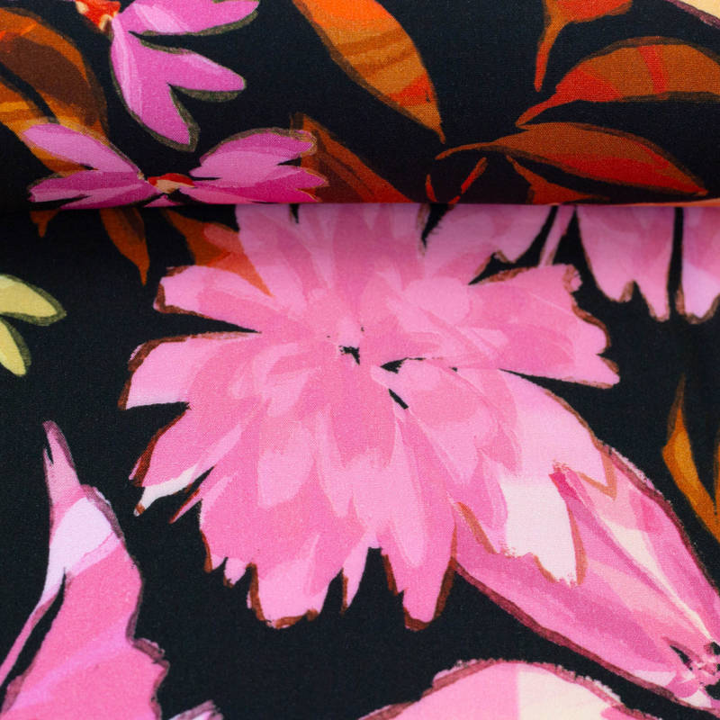Deze prachtige viscose met zwarte ondergrond en grote, kleurrijke bloemen is een echte blikvanger. De soepele stof valt mooi, ademt goed en draagt heerlijk luchtig. Perfect voor jurken, blouses, rokken of een zwierige jumpsuit.